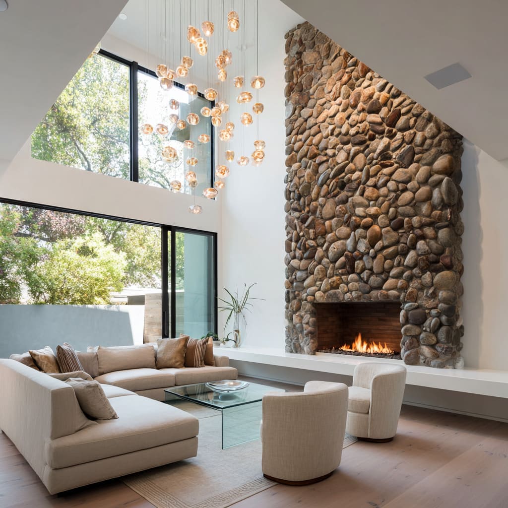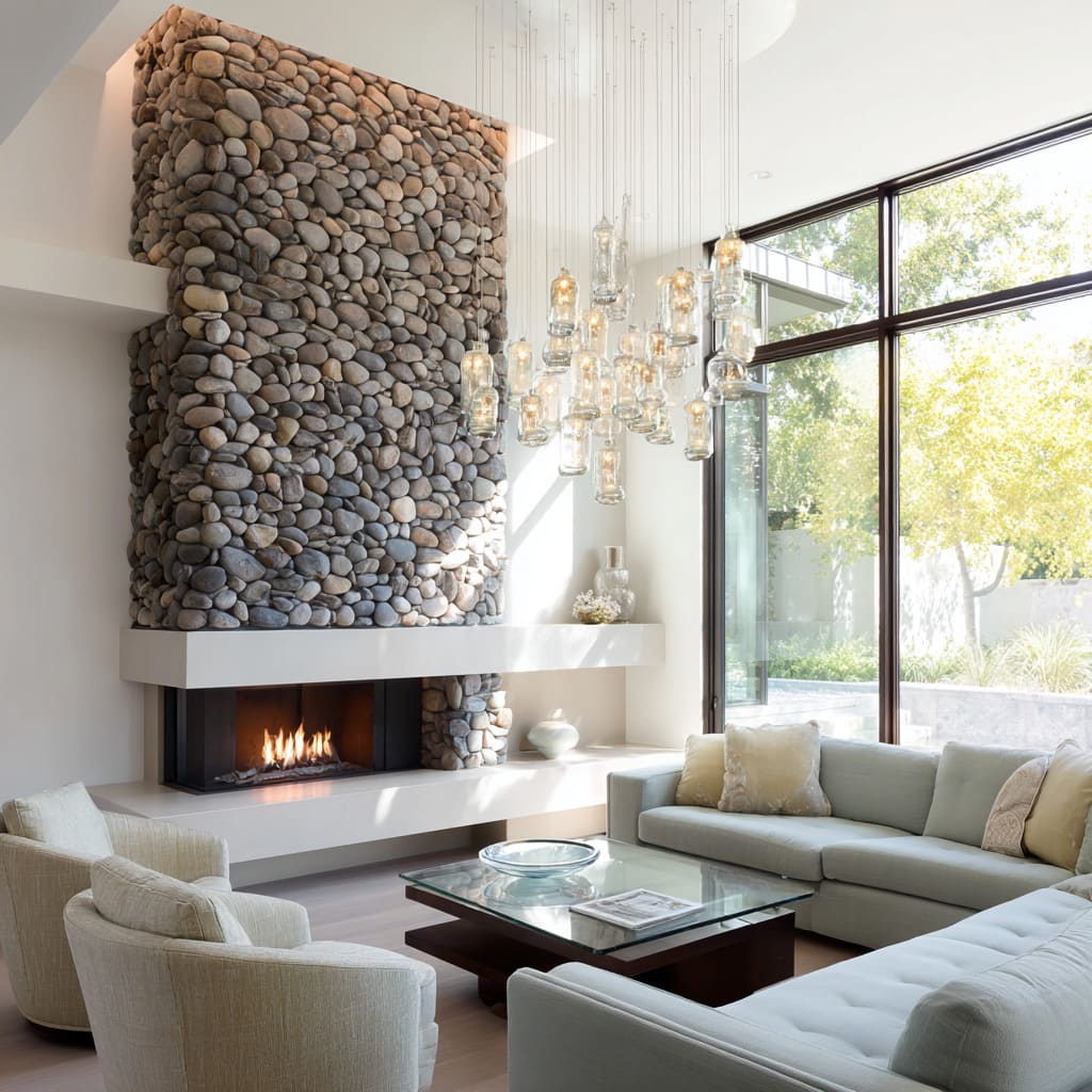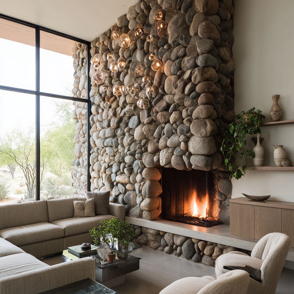 This is where river rock fireplace ideas become unexpectedly modern: the roundness is not hidden; it is echoed elsewhere in a refined way (more on that in the lighting section). The room doesn’t fight the organic quality—it pairs it with clarity.