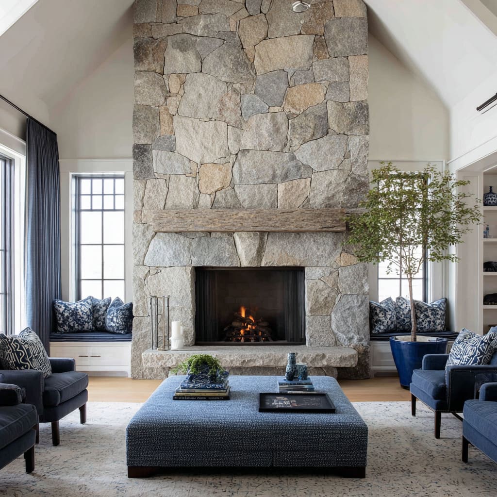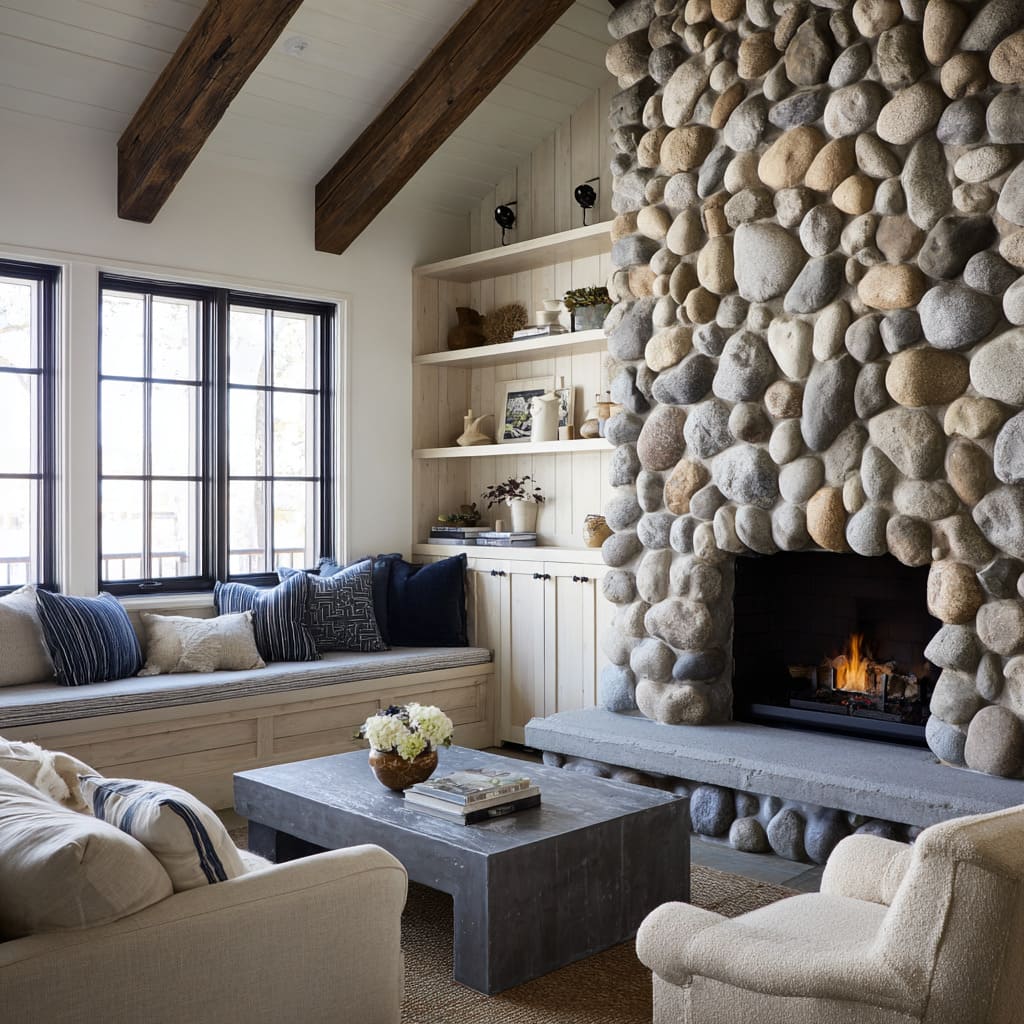 This is where river rock or large, rounded stone reads like a cliff inside a clean interior design. The firebox feels like a warm opening carved into a natural mass.