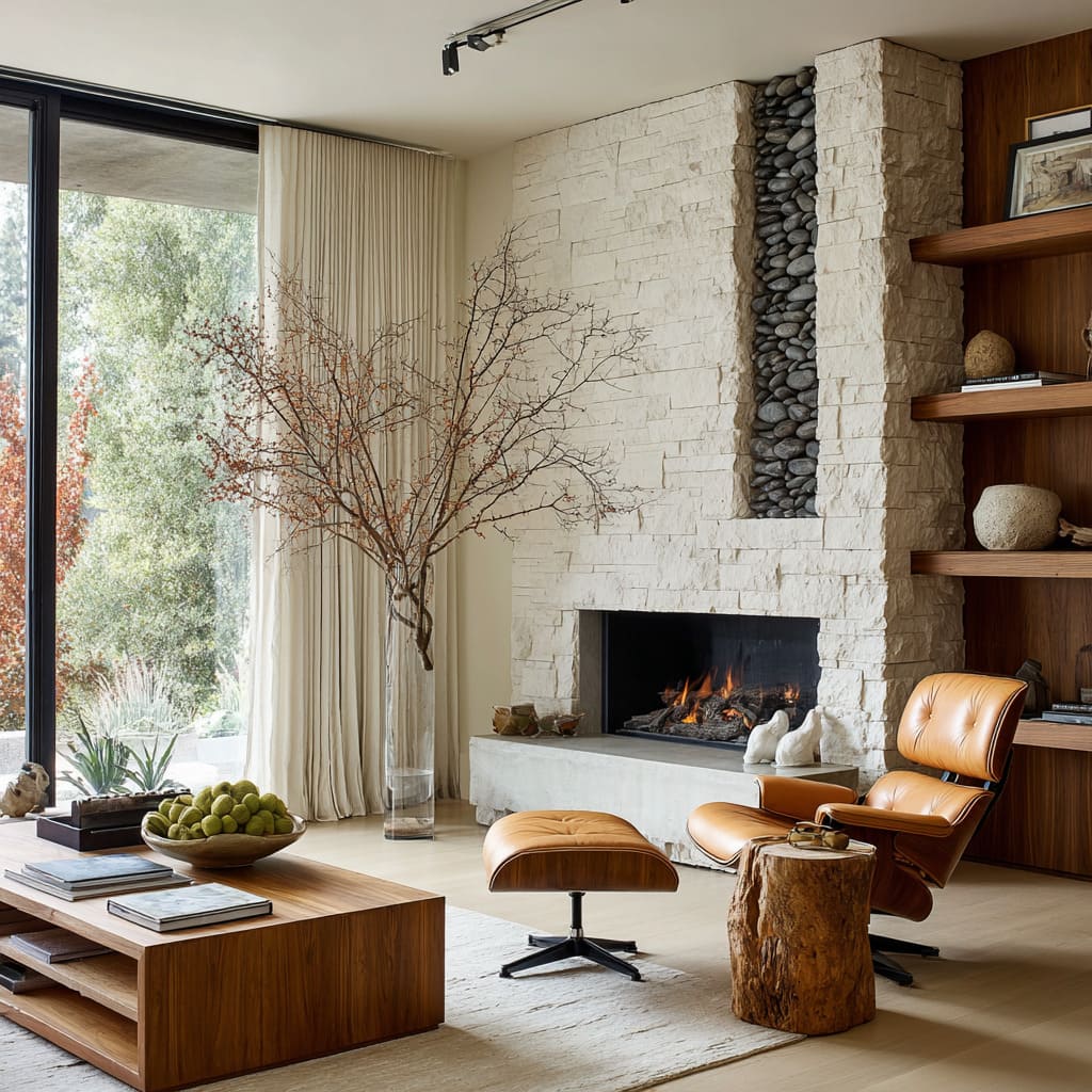 This is a major gap in many stone fireplace rooms: people try to add warmth with many accessories. The niche approach adds warmth through composition instead of quantity.