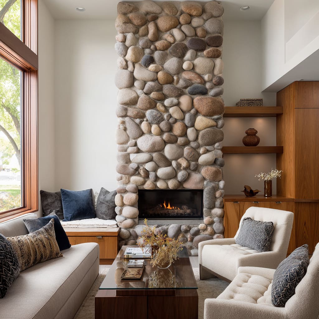This is where many fireplace rock designs miss the mark: people focus on matching colors, but the more powerful match is shape language. When the room echoes the stone’s geometry—round with round, linear with linear—the fireplace feels integrated even if everything else is very minimal.