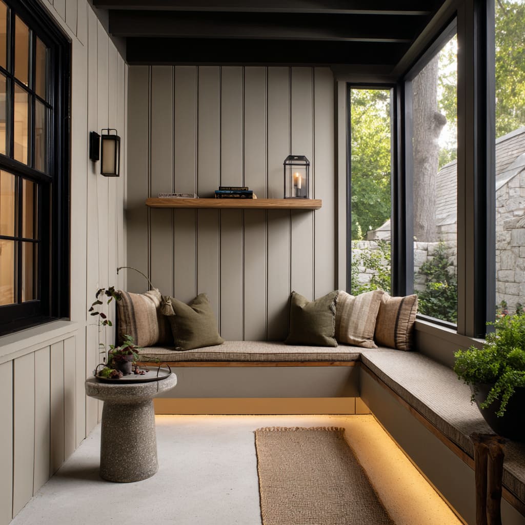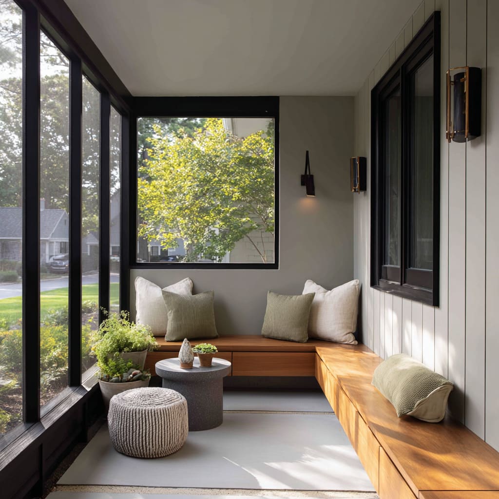 Across the most admired modern enclosed front porch ideas, color restraint defines sophistication. Neutrals dominate—stone, sand, blackened bronze, warm oak, pale grey—and outdoor greenery becomes the actual accent.