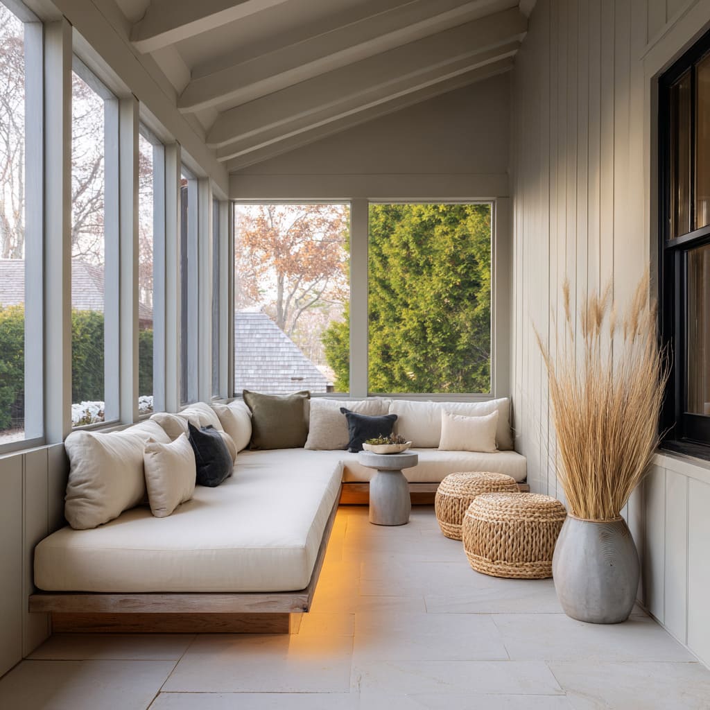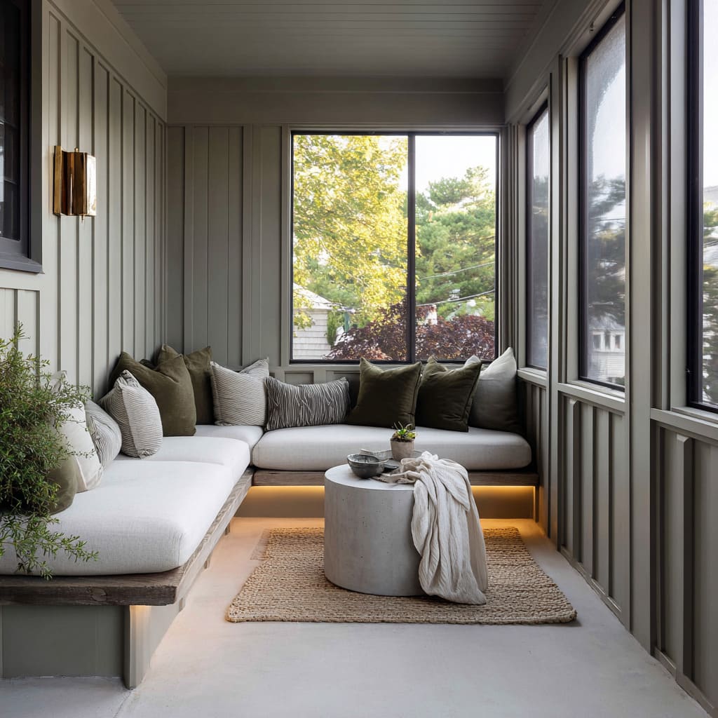 A porch once served as a shaded pause before the front door; now, in modern enclosed front porch ideas, it becomes an intentional room shaped by rhythm and proportion. Many contemporary porches adopt built-in seating or long sectional lines that run parallel to the house façade.