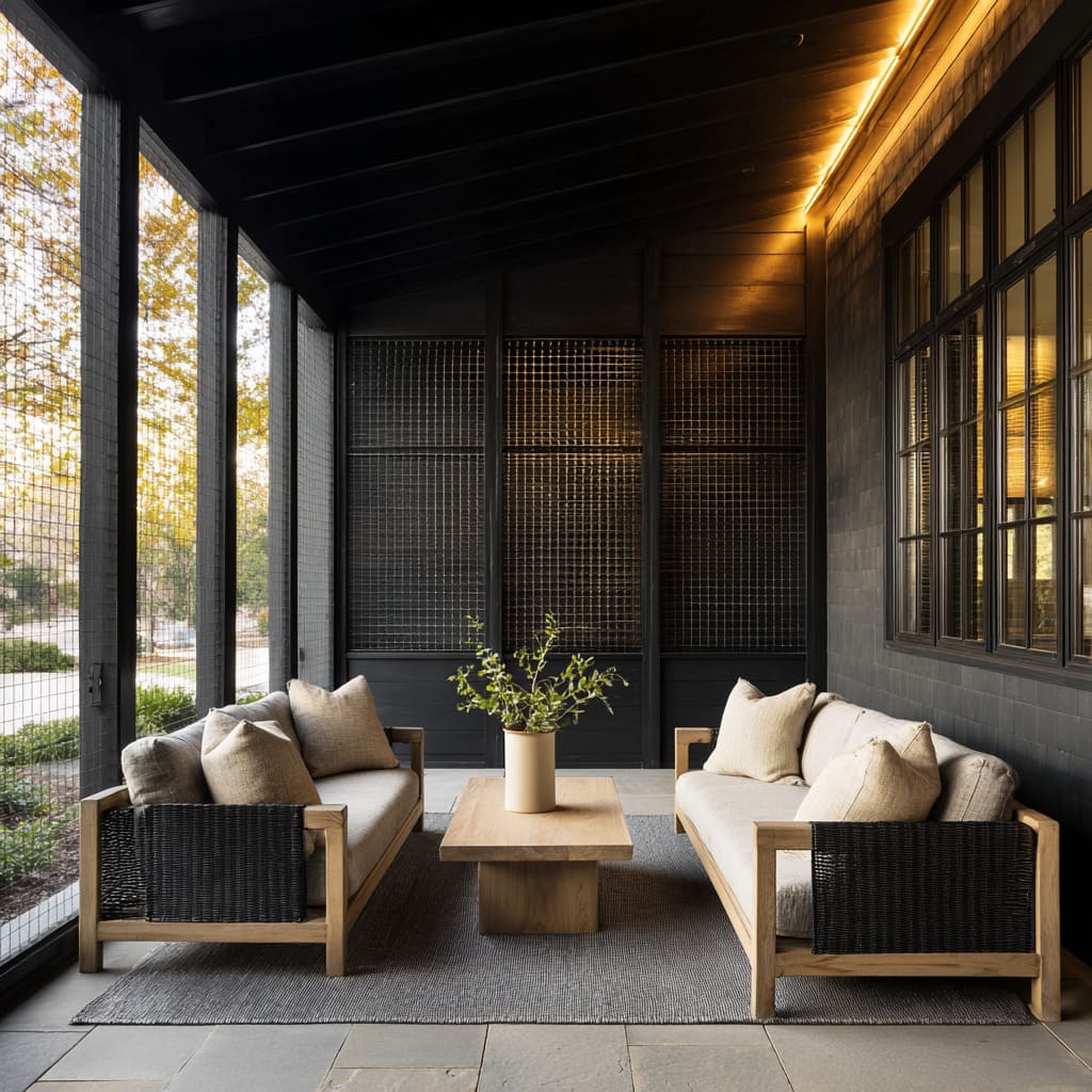 The discipline of limited tones is what makes a modern screened in porch idea look expensive without extravagance.