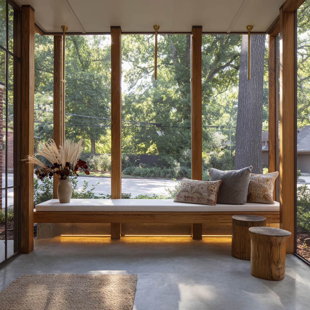 Such benches replace loose chairs, making the porch feel part of the home’s geometry. Minimal frameworks in black, bronze, or white-oak finishes create visual cadence that defines structure without visual noise.