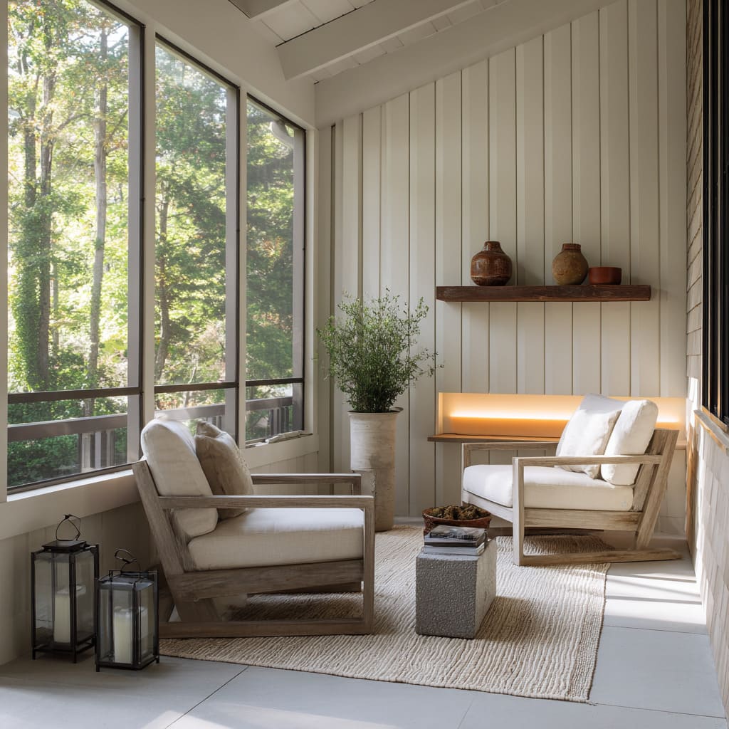 A defining characteristic of the newest modern screen porch ideas is the interplay between strict structure and soft shape. Architectural framing remains rectilinear—posts, boards, ceiling beams—but the décor introduces gentle curves to break the rigidity.