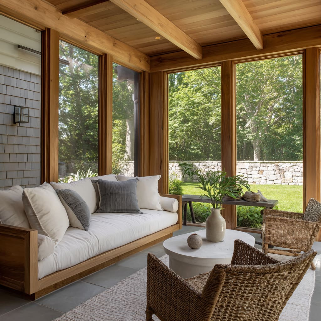 Screens, once purely practical, have evolved into aesthetic surfaces in today’s modern screen porch design language. Fine mesh now reads like woven fabric; ribbed lower panels blur the view just enough to create privacy while catching daylight in soft patterns.