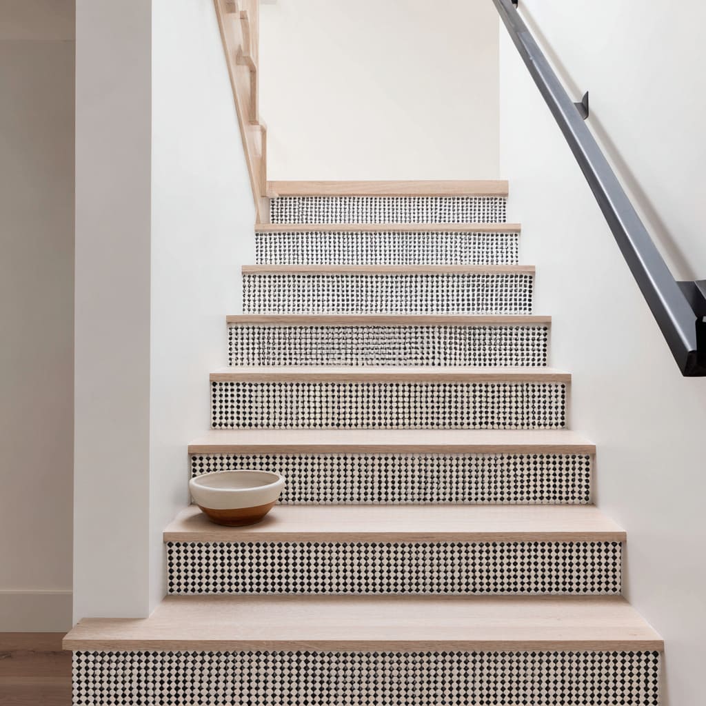 Where illustration adds charm, pattern adds order. Many modern stair riser ideas rely on micro-scales: tiny stamped ovals, petite marks arranged in lines, or penny tiles forming soft graphic surfaces.