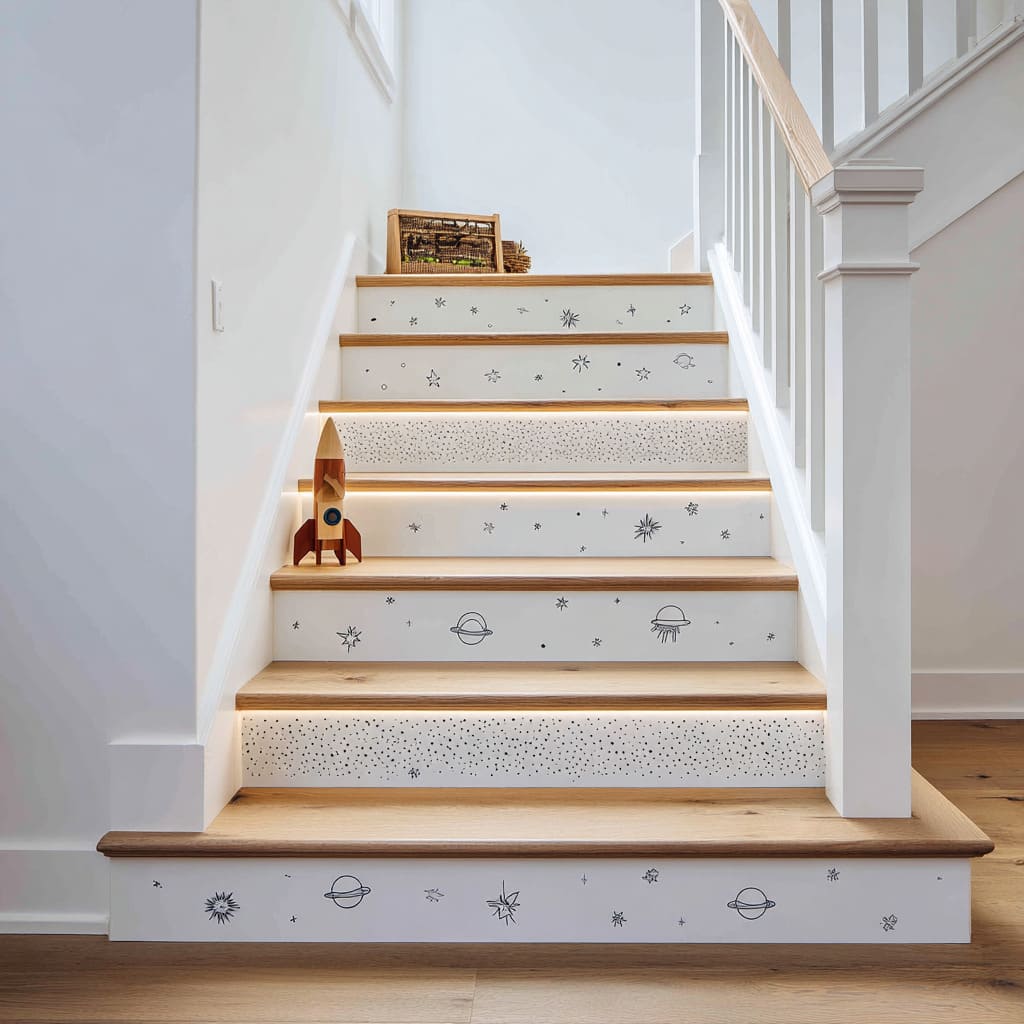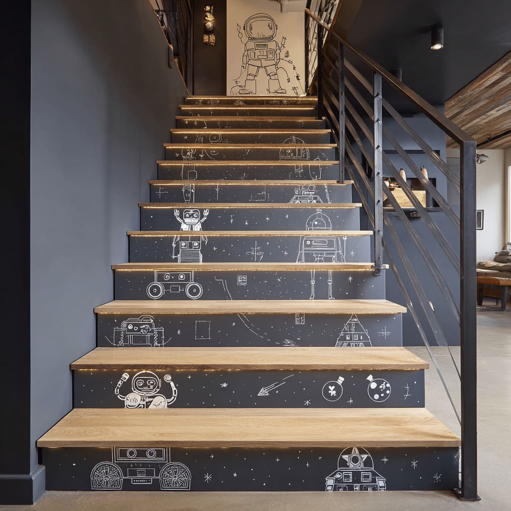 Charcoal stair risers inspo with white space-themed line drawings, warm oak treads, and subtle under-tread lighting for a dramatic graphic staircase