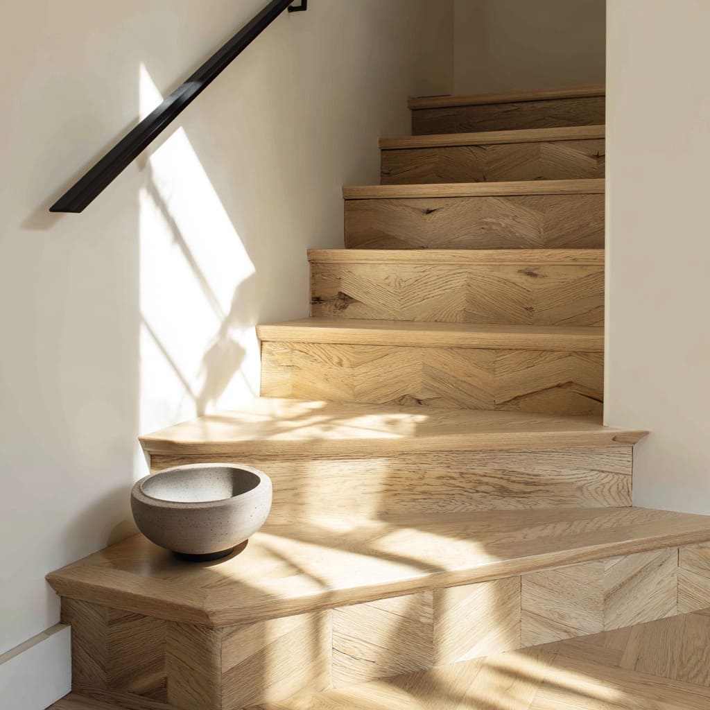 Chevron timber adds even more energy, where each V flows up the stair in soft geometric motion, and each tread edge provides a slim warm stripe that keeps the steps legible. Ribbed wood brings another mood — narrow grooves catch sunlight at different spots during the day, turning each riser into a surface that responds to daylight.
