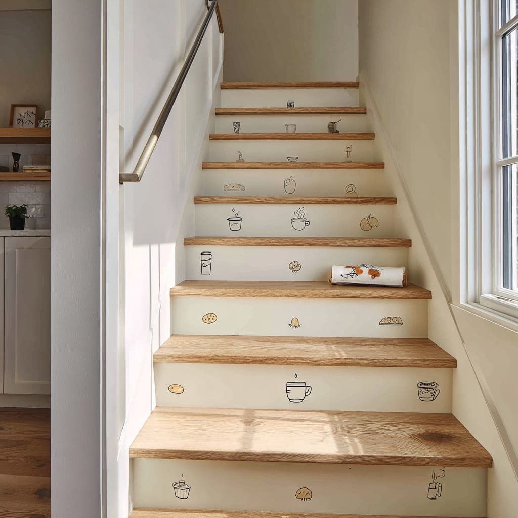 Cream stair risers inspo with tiny cafe-style doodles, slim oak nosings, brushed metal rail, and soft daylight for an airy bakery-inspired stair idea