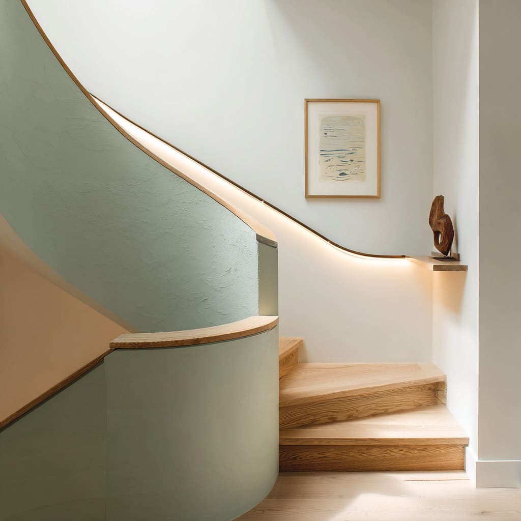 Curved stair design in sage plaster with slim oak cap, plain oak risers, and soft hidden lighting for an organic calm stair bay