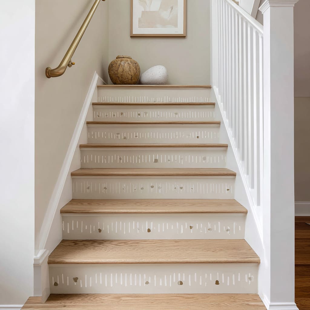 These decorative stair riser ideas behave like fabric panels on a vertical plane, adding rhythm and personality while staying light and neat.