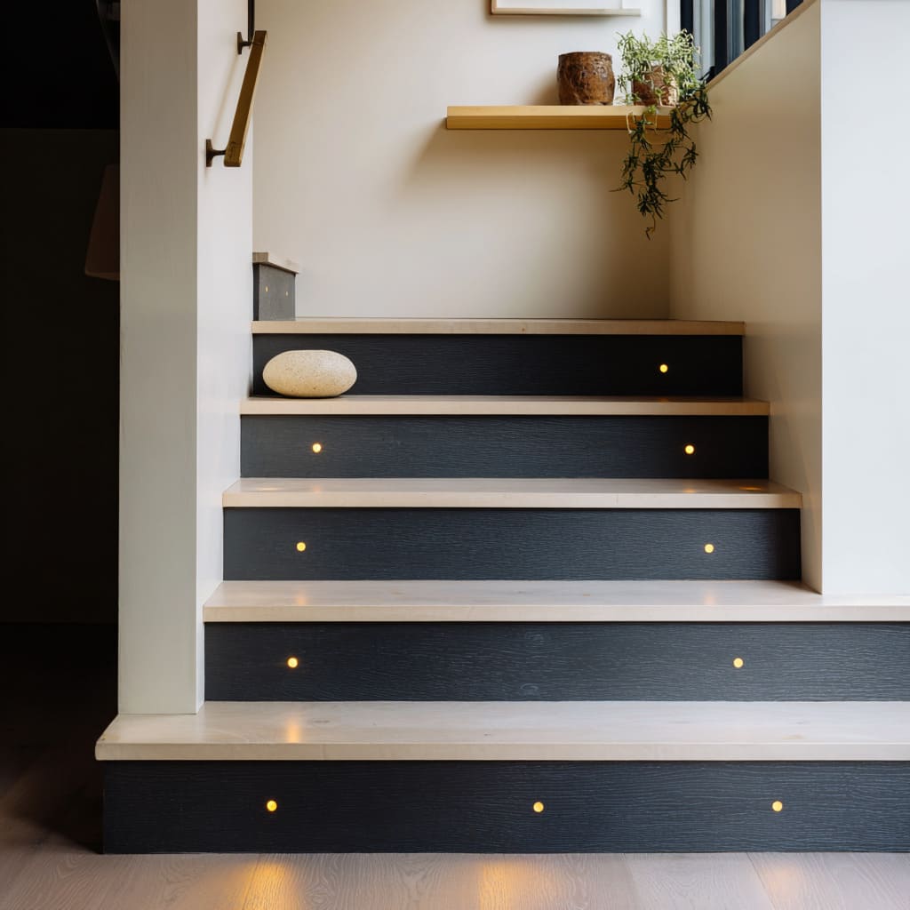 Lighting themes present in stylish stair riser ideas:.