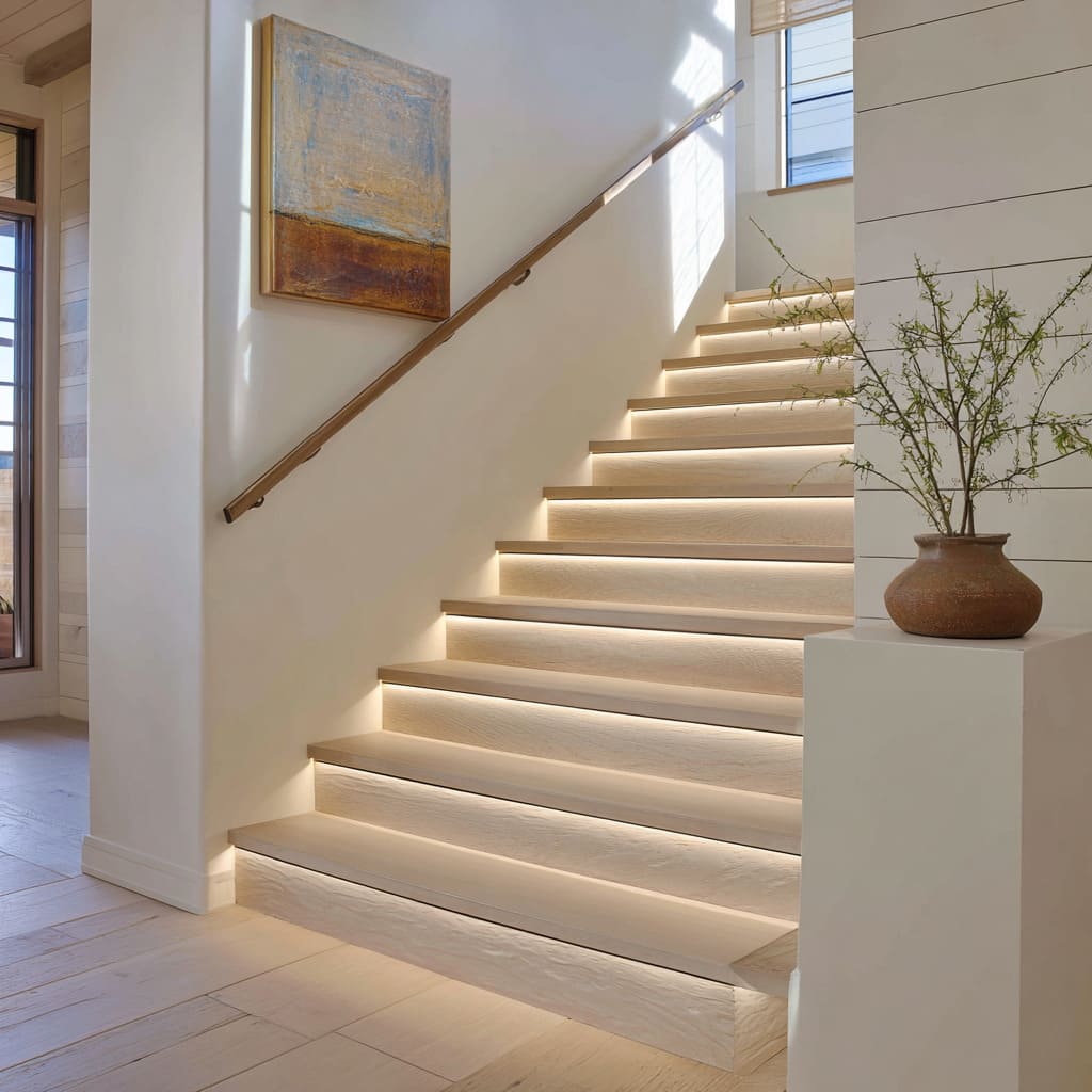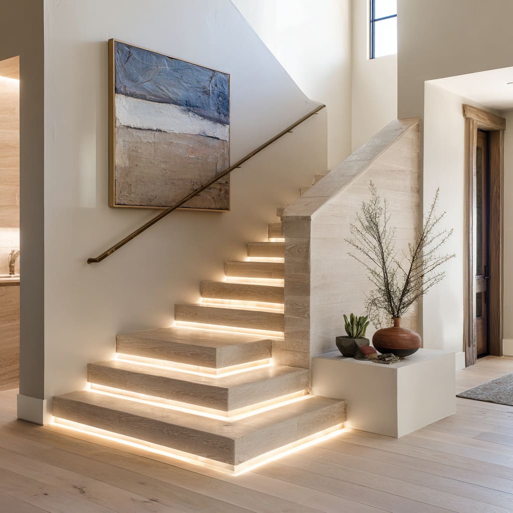 Layered light-wood illuminated steps design with full-perimeter warm lighting and soft clay decor for a sculptural gallery-style staircase