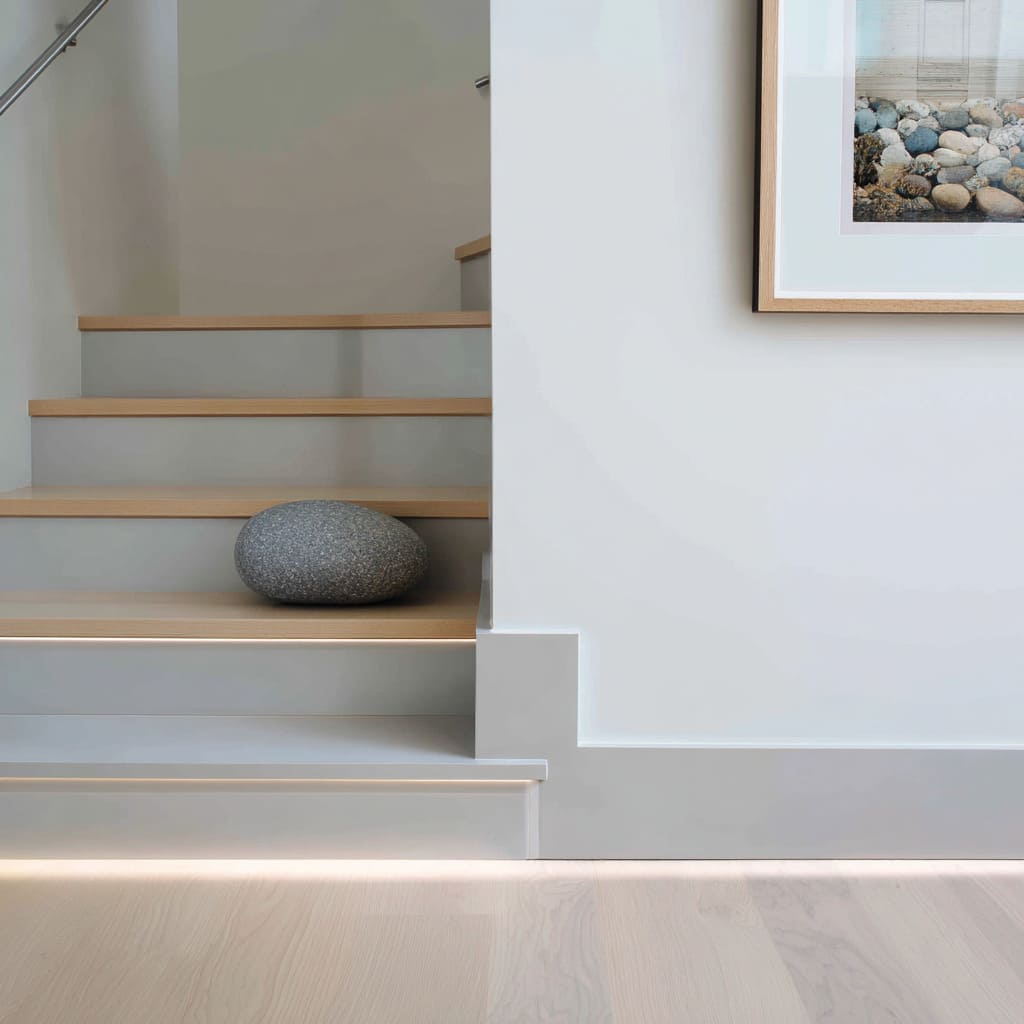 These lines repeat up the stairs in soft rhythm and often echo elsewhere — along the base of a wall, under a bench edge, or beneath a slim handrail.