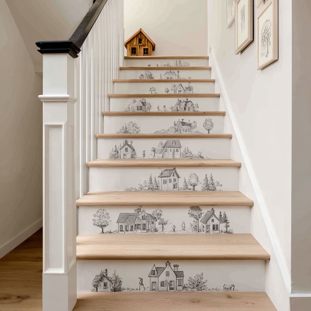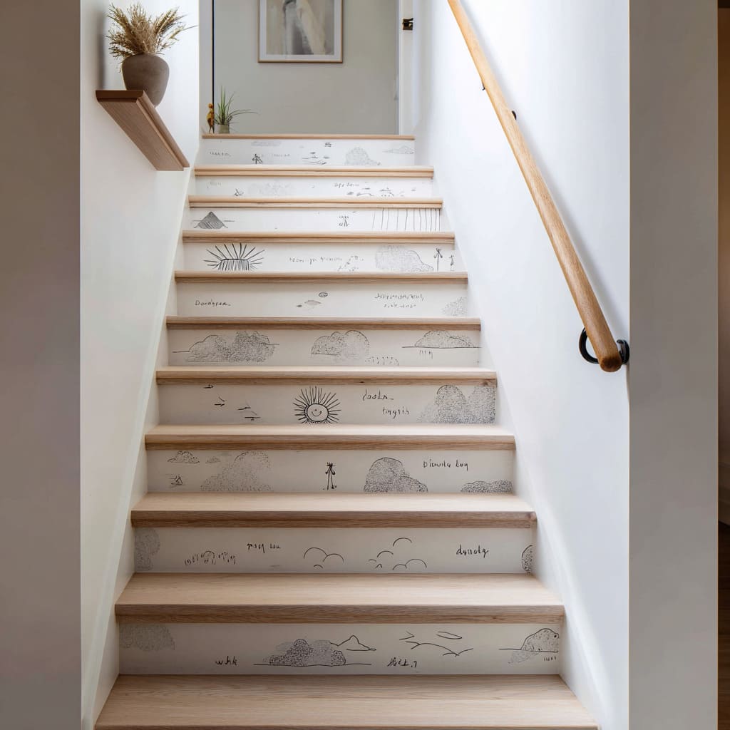 Stair riser decoration ideas have embraced illustration in a subtle, grown-home way. Instead of loud murals, delicate pencil-style drawings stretch across risers like a story told in tiny chapters.