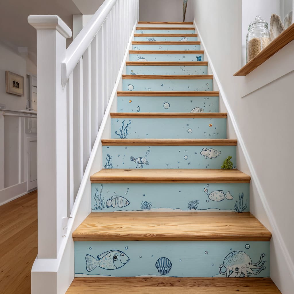 Light-blue stair design hand-drawn ocean motifs, warm wood treads, white balusters, and shell decor for a gentle seaside stair mood