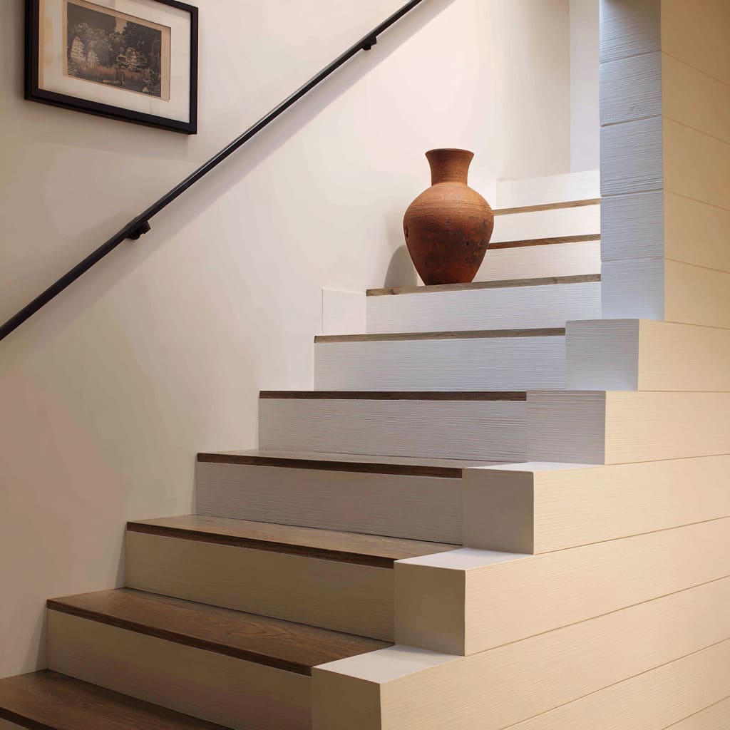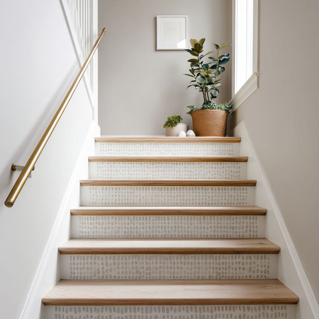 These approaches show how decorative stair risers can stay natural and calm while still bringing layered visual movement without bright color or loud prints.
