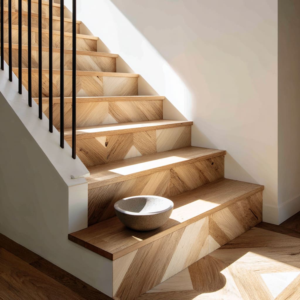 Oak chevron stair risers ideas with lengthwise oak treads, white stringer, and stone bowl decor for a crafted wood parquet staircase
