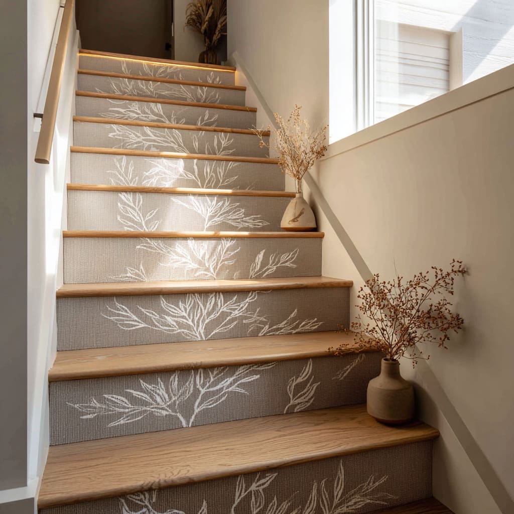 Taupe risers design with white botanical pattern, oak nosings, clay vases, and warm rail glow for a calm nature-infused stair look