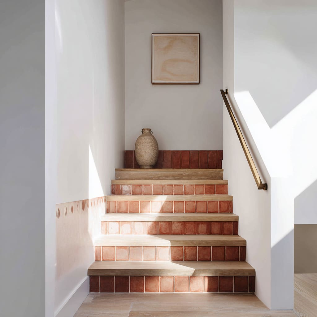 Terracotta tile stair concept with soft glaze variation, pale oak treads, tile wainscot, and warm brass accents for an earthy handcrafted style