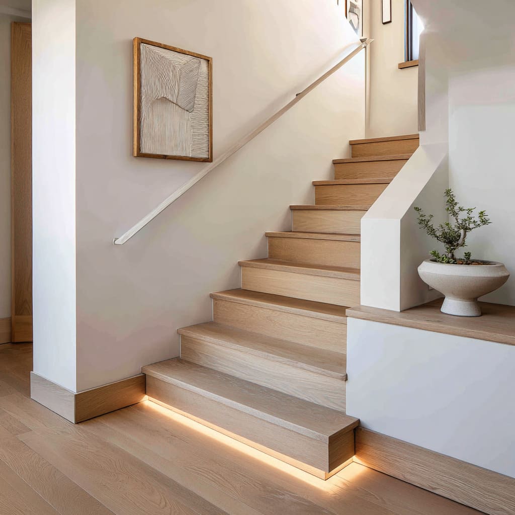 Uniform pale-oak stair concept and treads with a soft base light, white guard, and bonsai decor for a calm wood staircase look