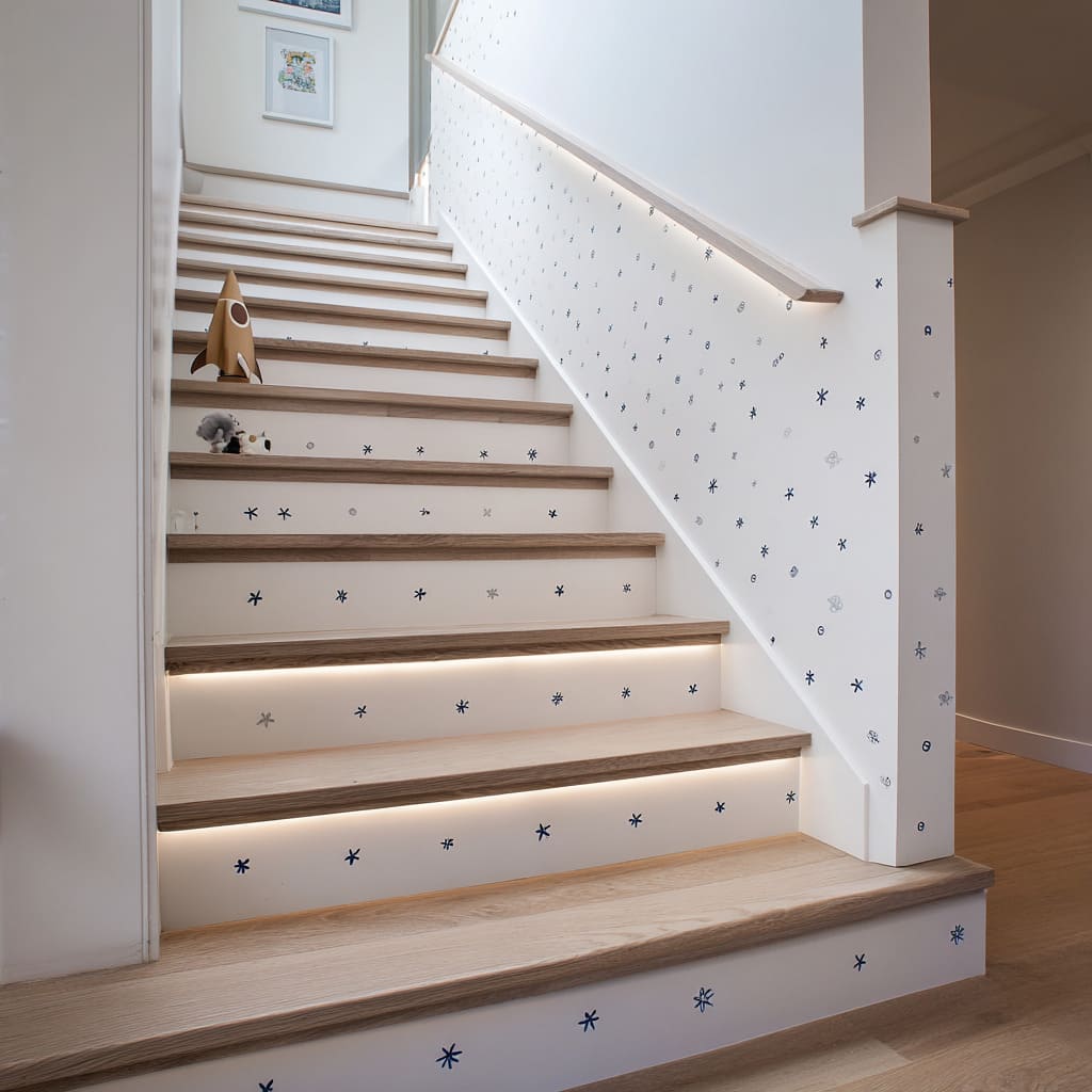 Decorative stair risers today build softness and character by giving each step a small role in a larger composition. Whether through oak grain, chalk-style doodles, handmade tiles, or micro lights, stair riser design has become a subtle art form — balancing simplicity with focus so the staircase feels like a considered piece of the home’s visual poem, not just a link between floors.