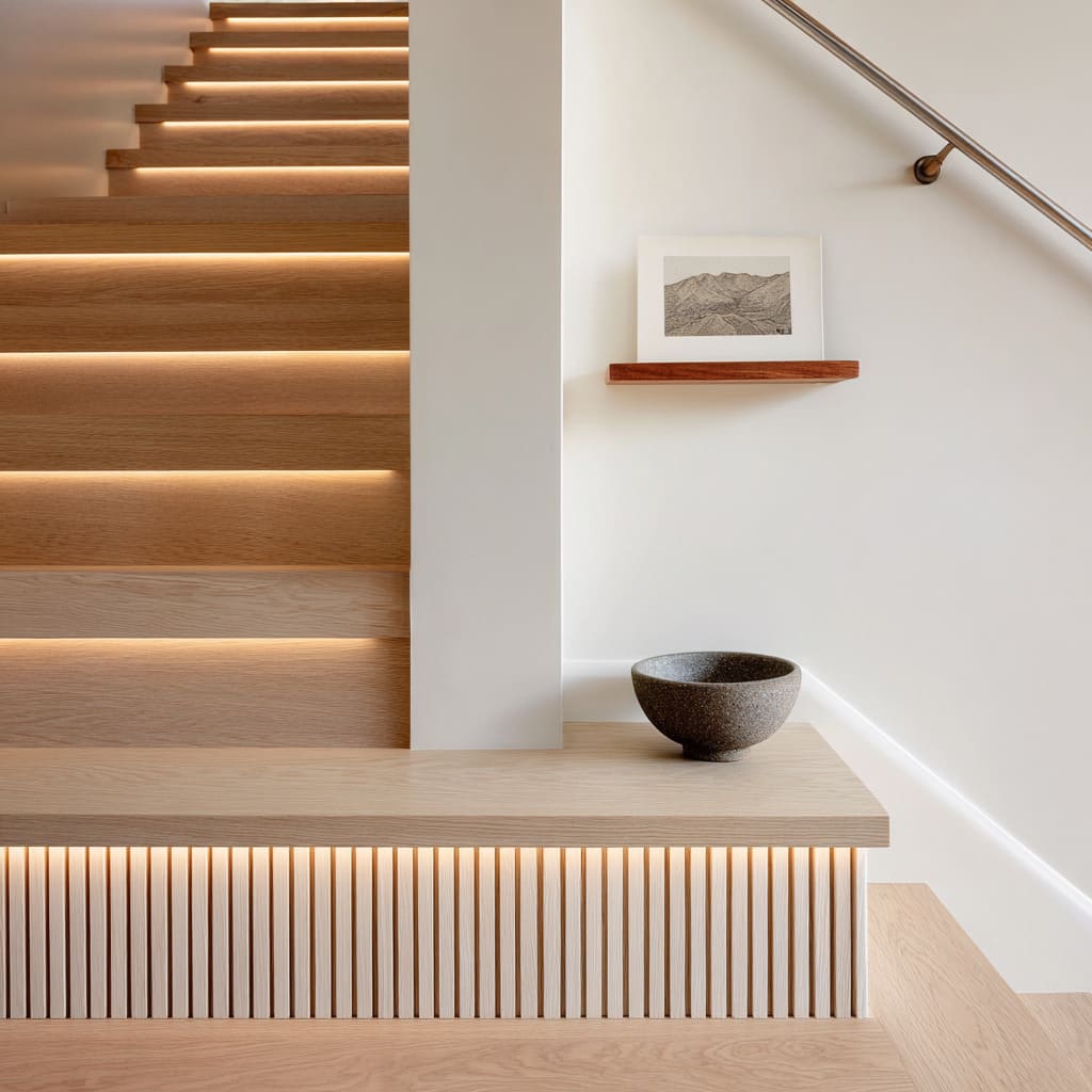 Wood stair risers concept with warm under-tread lights and matching lit bench, slim metal rail, and linear artwork for a unified evening glow