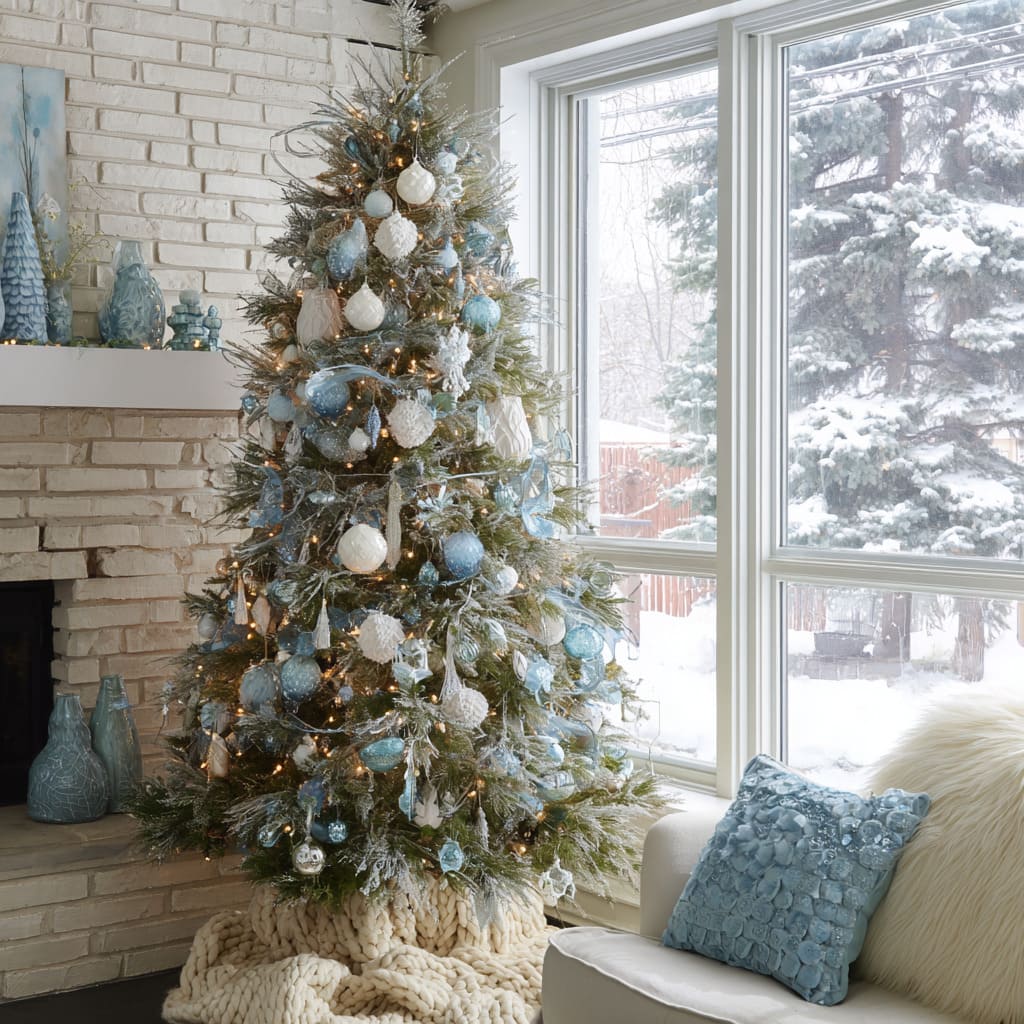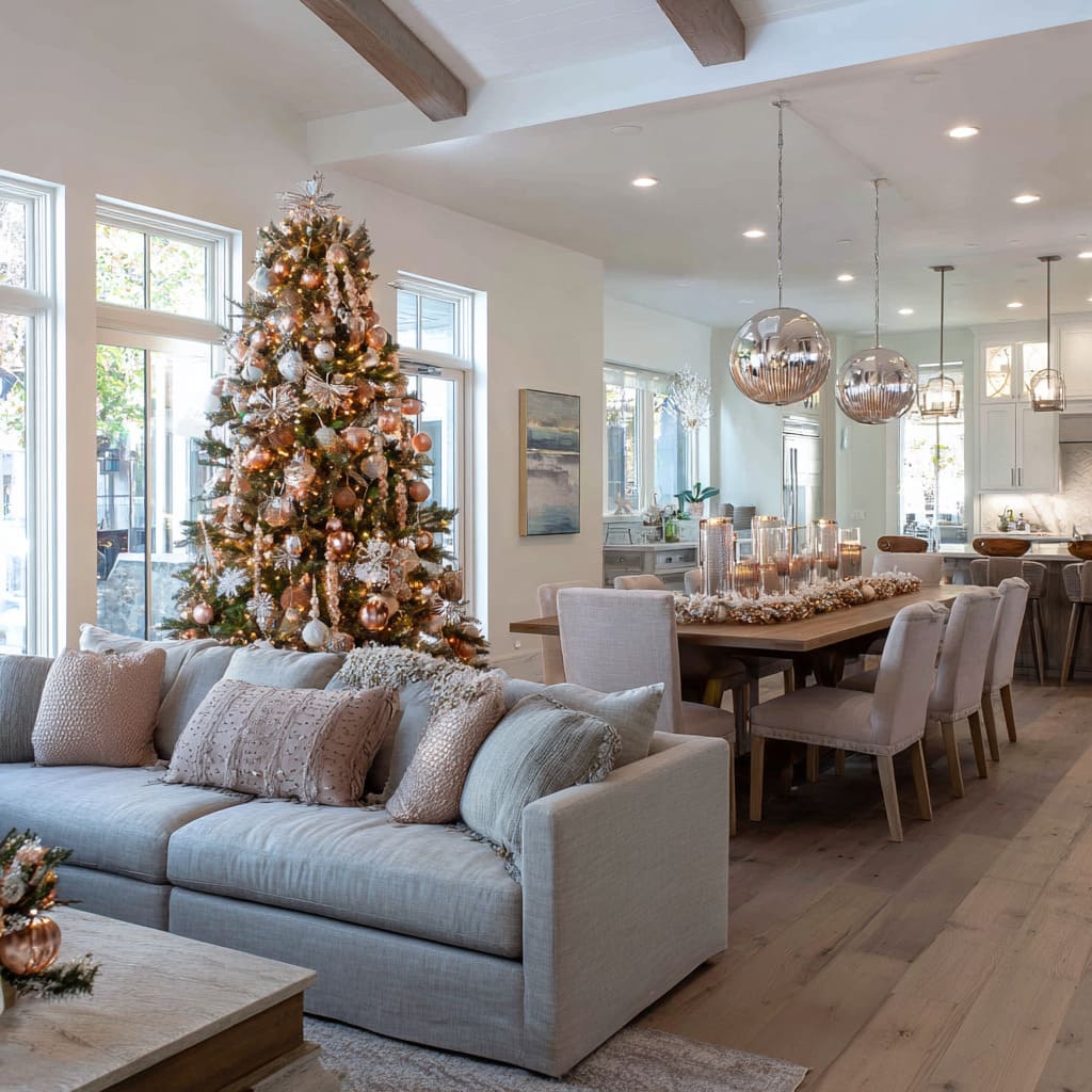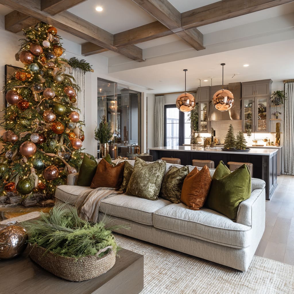 Every successful composition extends beyond the tree. Pillows, artwork, and tabletop decor quietly repeat its colors and materials.