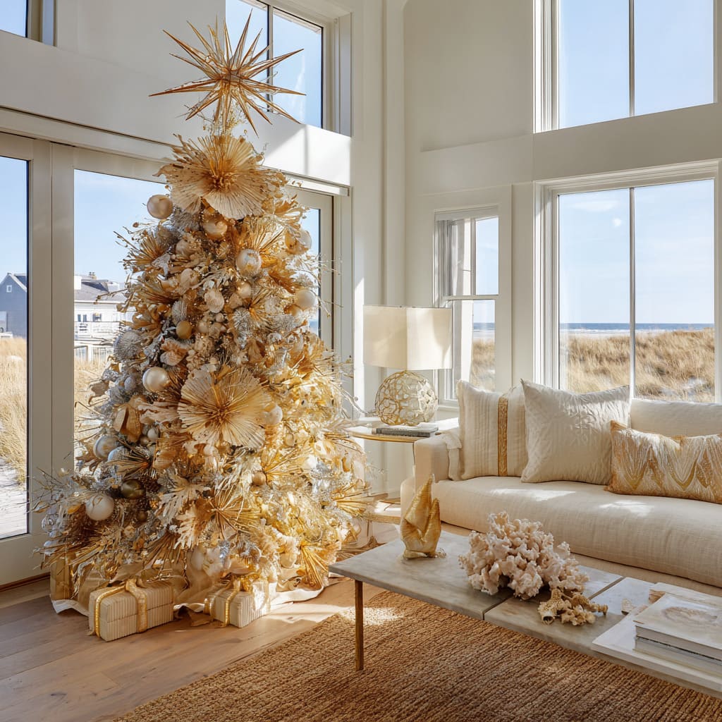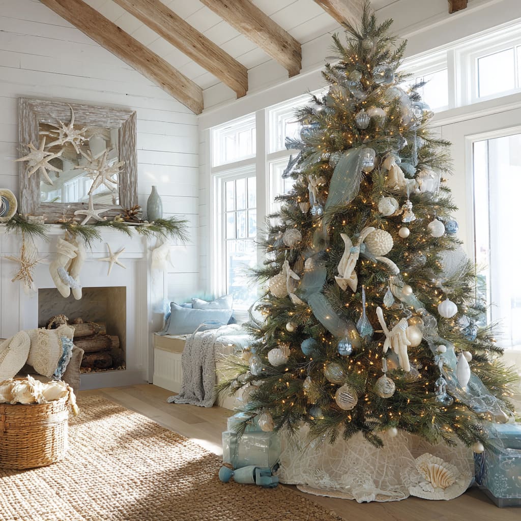 White or silver trees paired with sea-glass ornaments and shell forms turn beach-town memories into modern light studies.