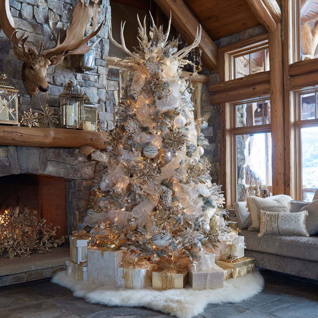 Flocked branches and icy metallics recall ski chalets yet lean on soft layering instead of red-green contrast.