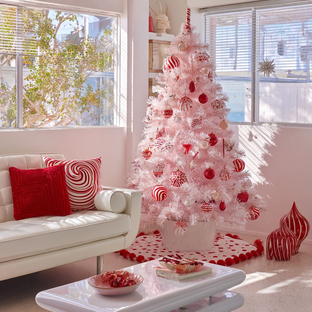 Textiles repeat the palette in quieter materials: boucle that hints at frost; velvet that deepens jewel tones; knit that softens candy stripes. Because the hues recur at lower intensity, the room reads cohesive even when the tree carries the shine.
