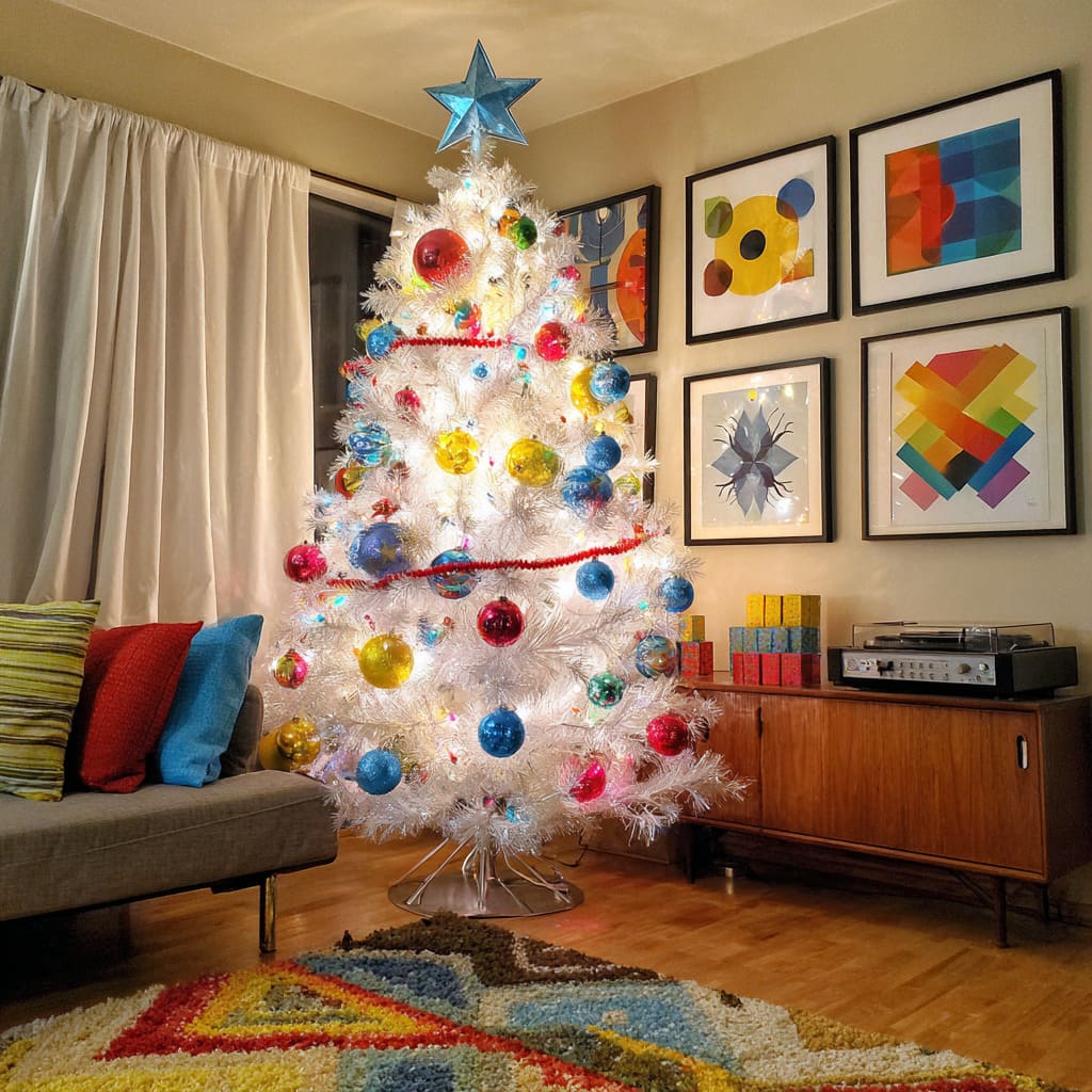 - Primary brights on white tinsel trees recall 1960s pop graphics.