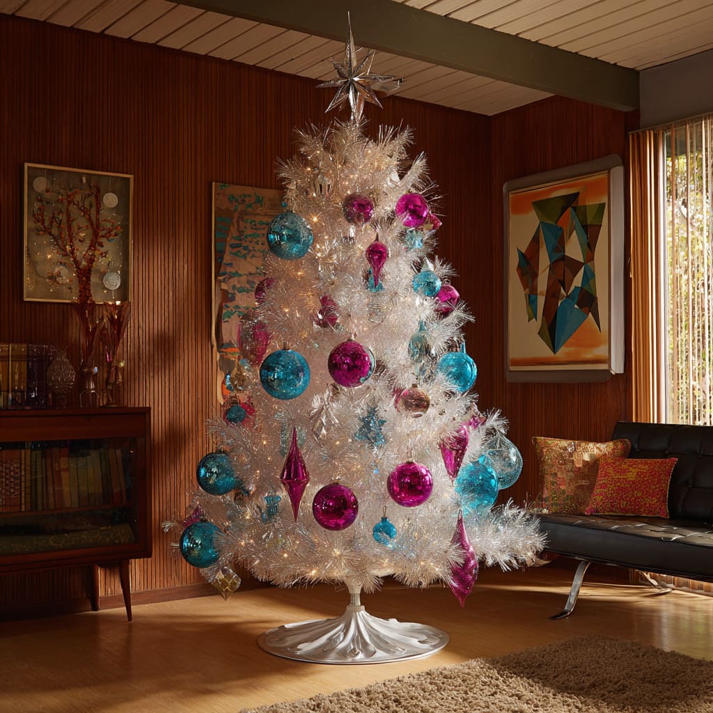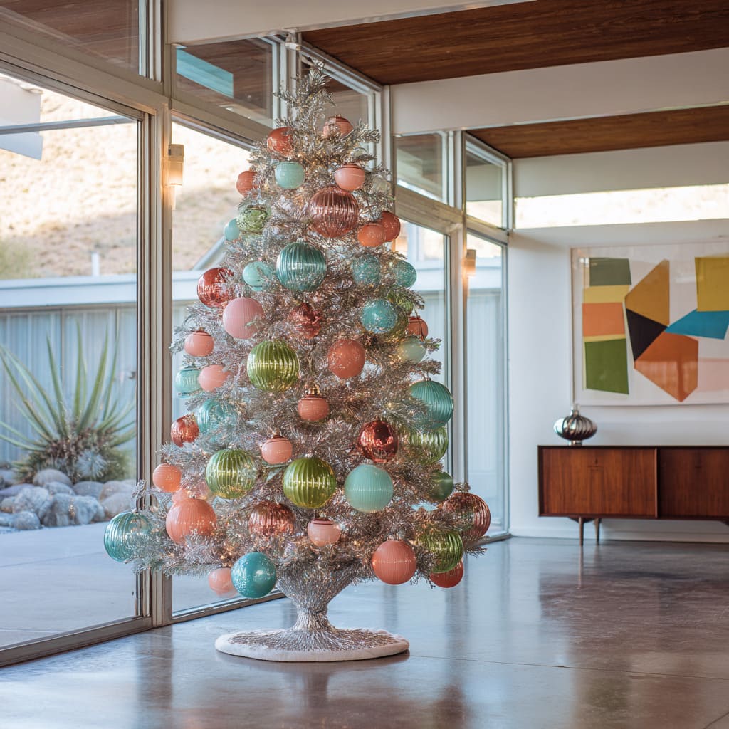 - Tinsel and aluminum trees use reflection to replace garland; daylight stripes through windows create moving patterns across metallic needles.