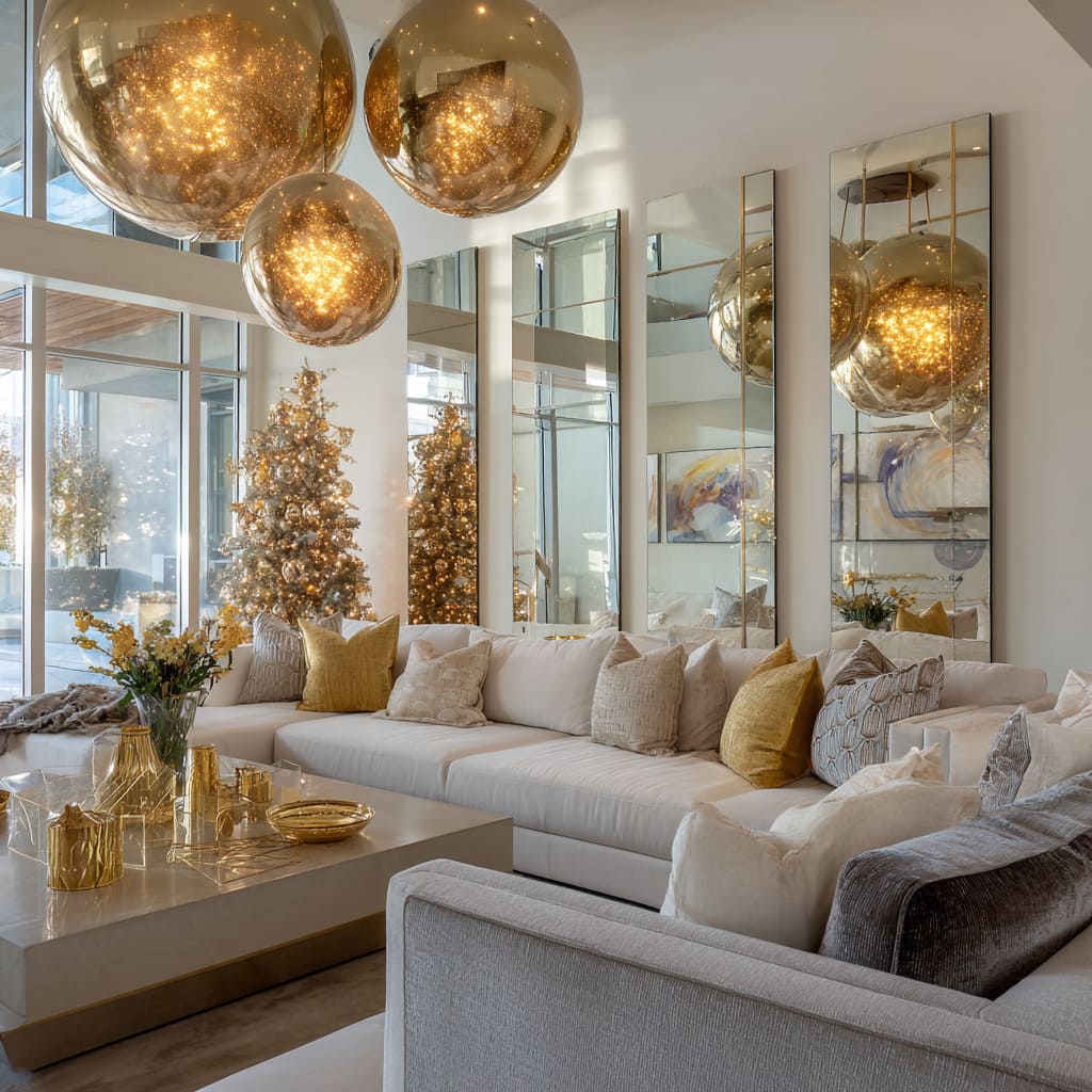 Mirrors, lacquer, and polished stone don’t just bounce light—they multiply motifs. A slim tree in front of panels becomes a glowing colonnade; mercury ornaments near a glossy sideboard throw miniature echoes across the room.