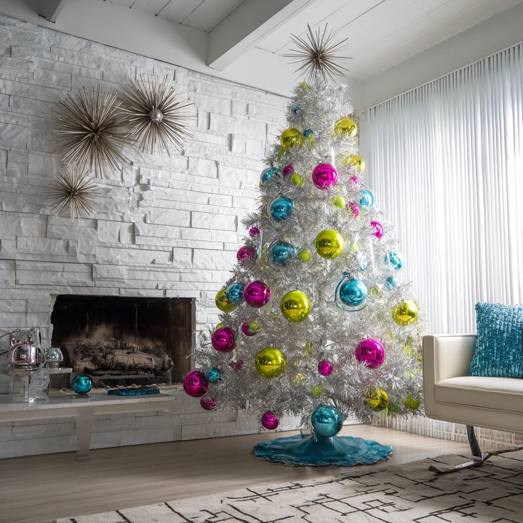 Aluminum trees, jewel-toned glass, and sputnik stars speak to the jet-age fantasy of optimism and design clarity.