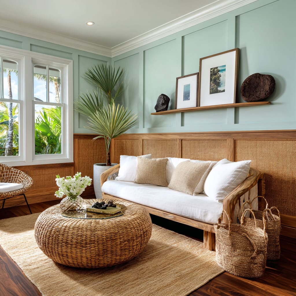 Cane inserts refresh box wainscoting, echoed in rattan and braided textures