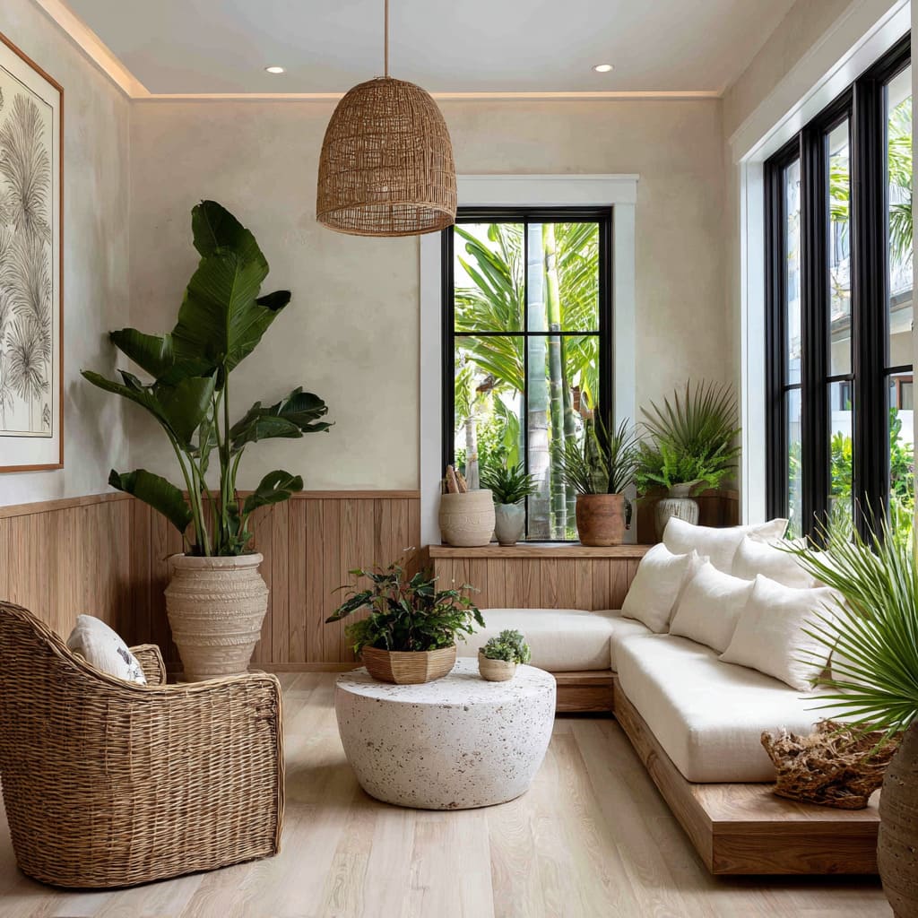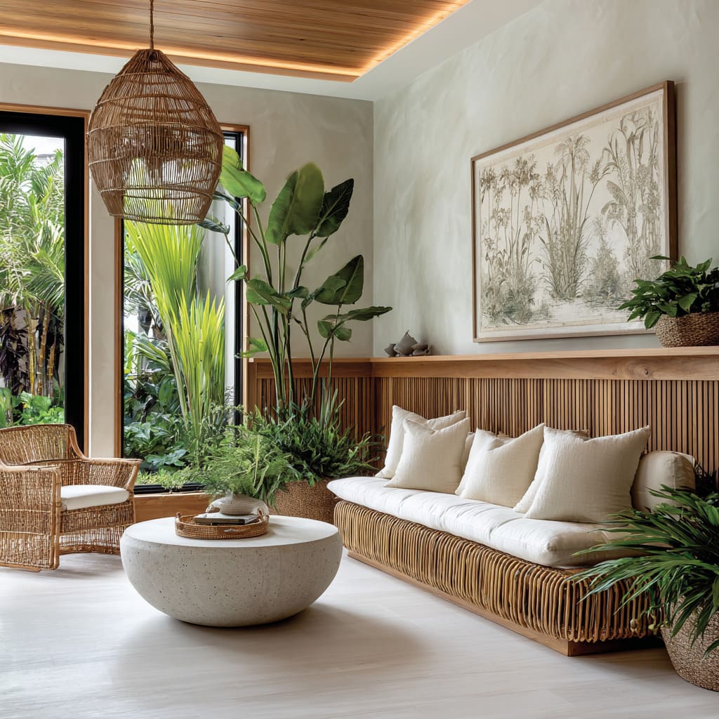 That idea ripples outward—rattan frames, braided rugs, woven stools—each one repeating the pattern logic at a different scale. Even when cane isn’t present, foliage takes over the role once played by carved ornament: palmetto fronds where pilasters might have been; a row of planters along the ledge acting as a living frieze.