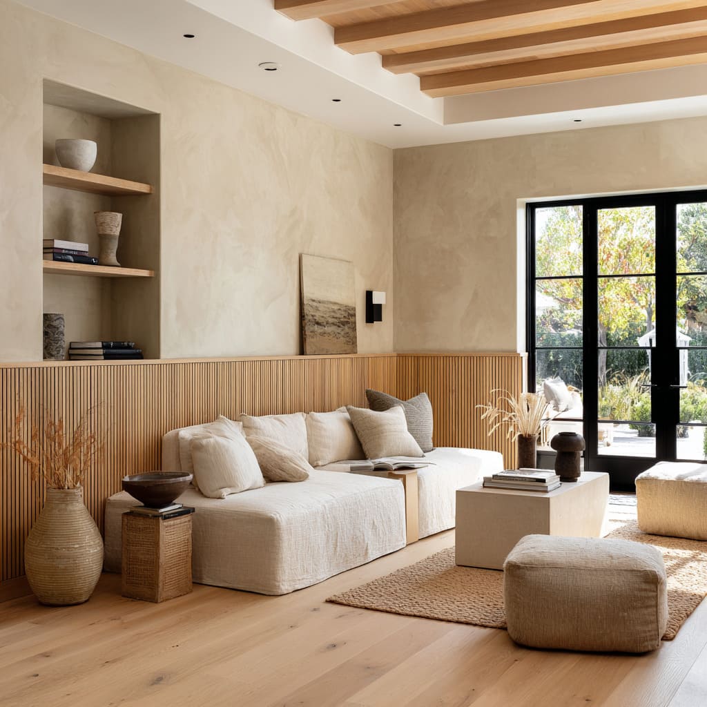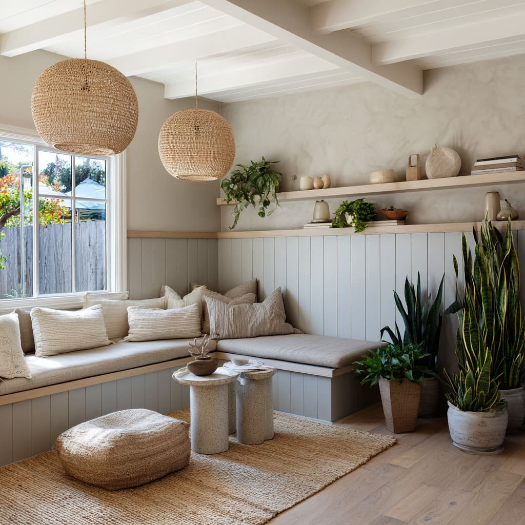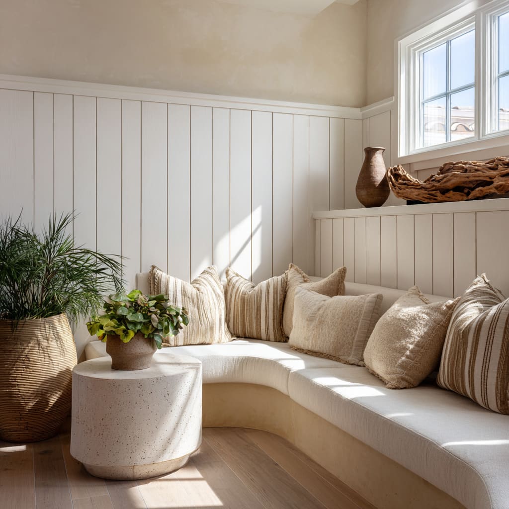 Wood wainscot merges with a platform sofa, accented by clay and woven planters