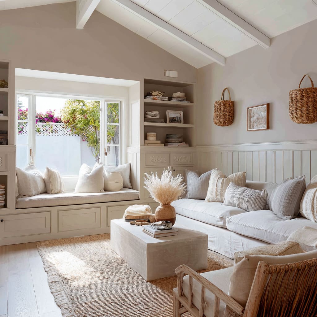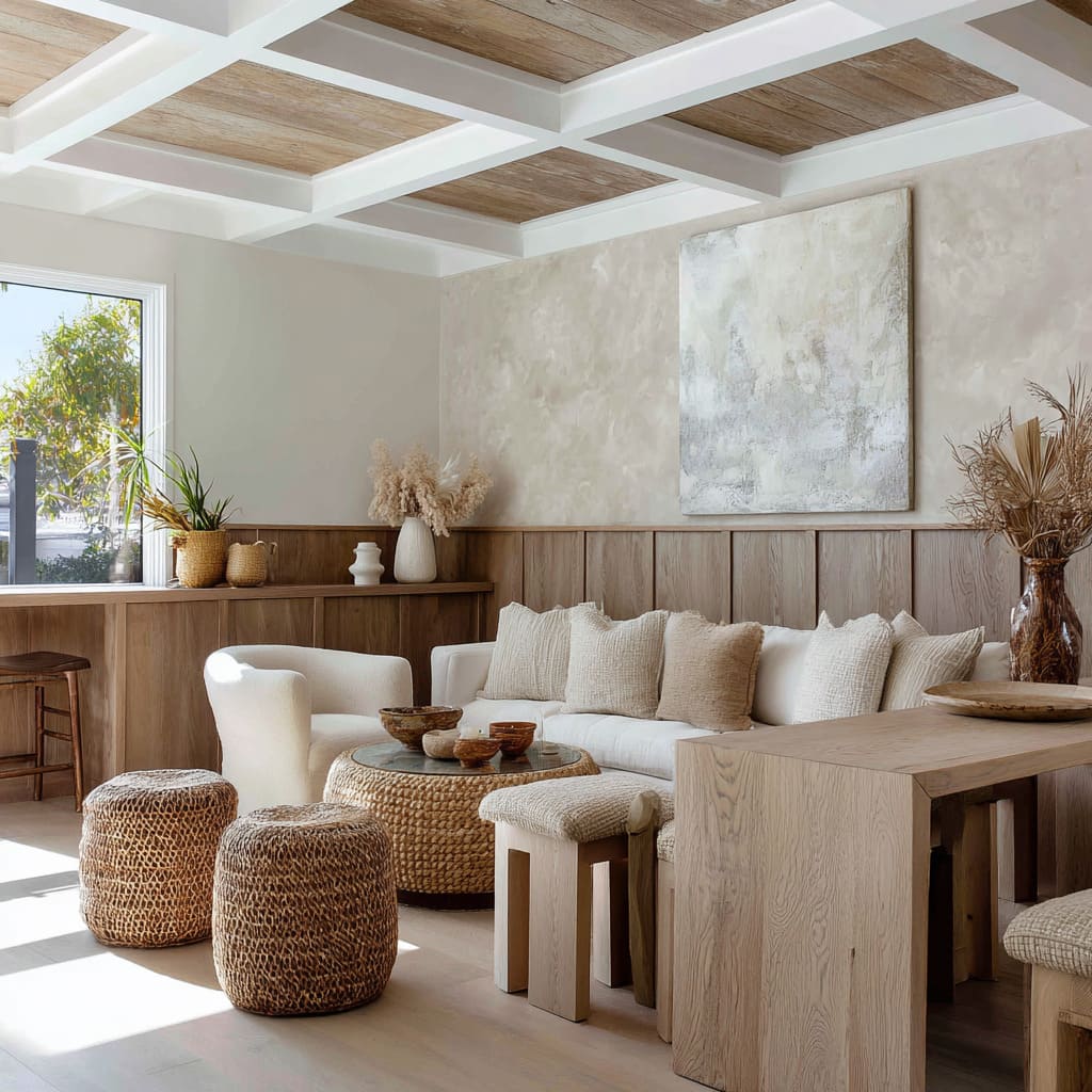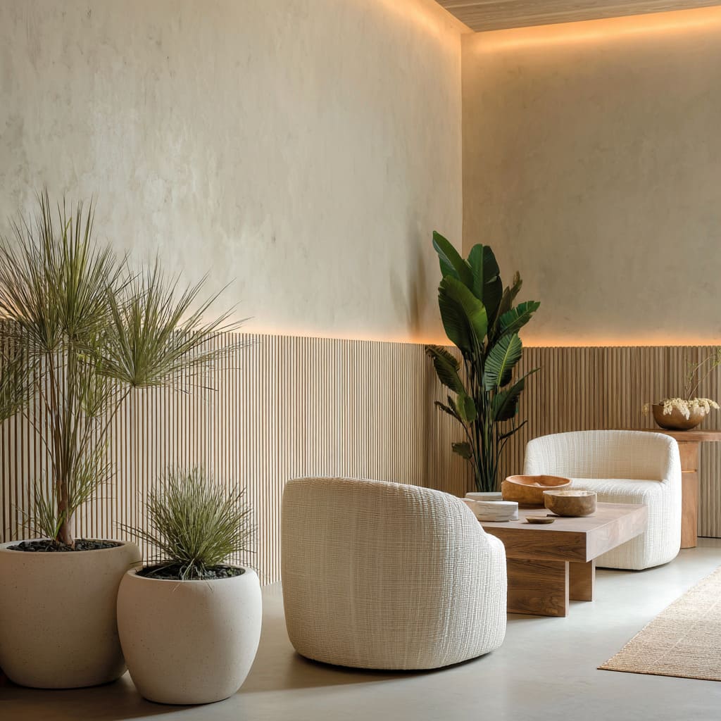 Wood wainscot merges with a platform sofa, accented by clay and woven planters