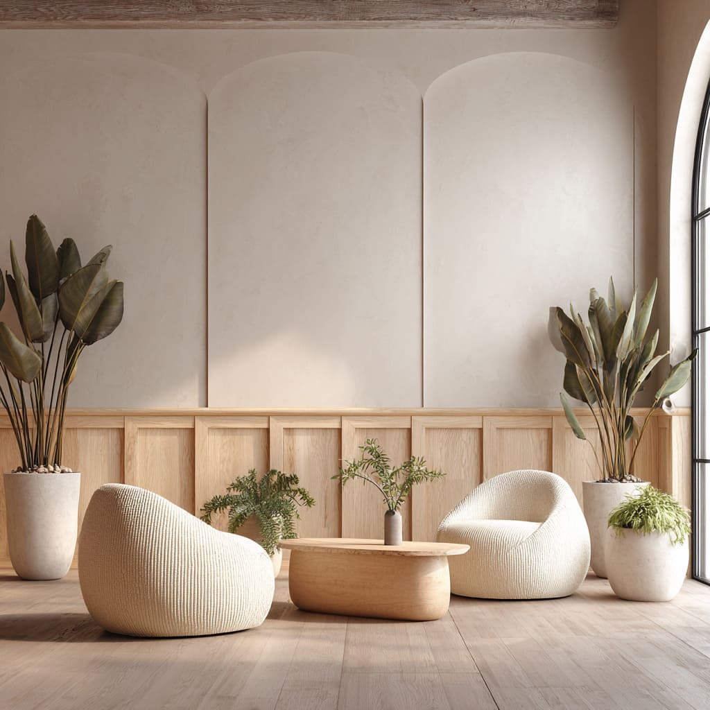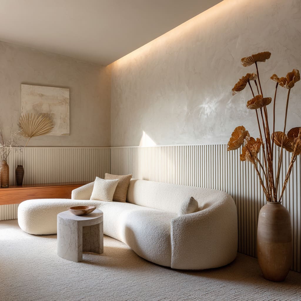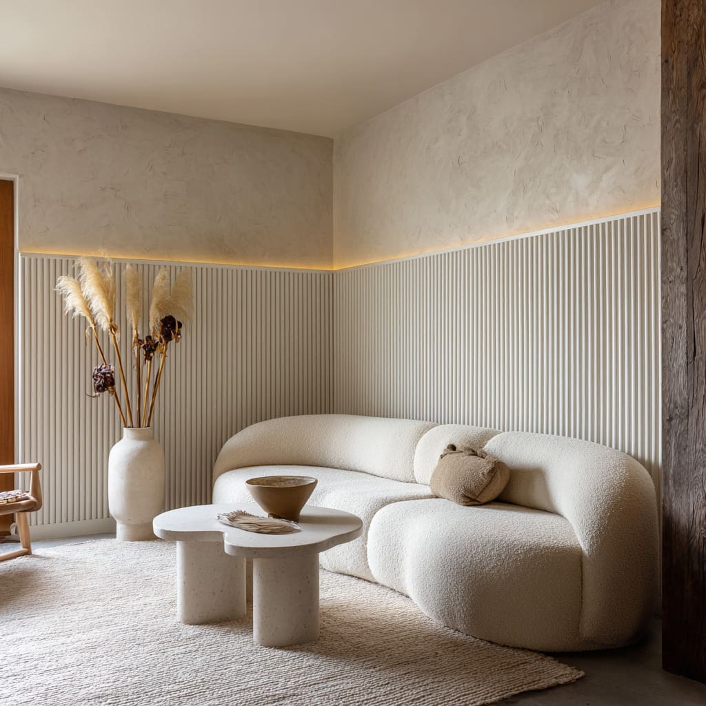 Flutes stand in for frames. Occasionally, the upper wall carries three shallow plaster arches—no trim, just soft radii—so light pools at the shoulders and the lower box paneling becomes a crisp base for simple shapes above.