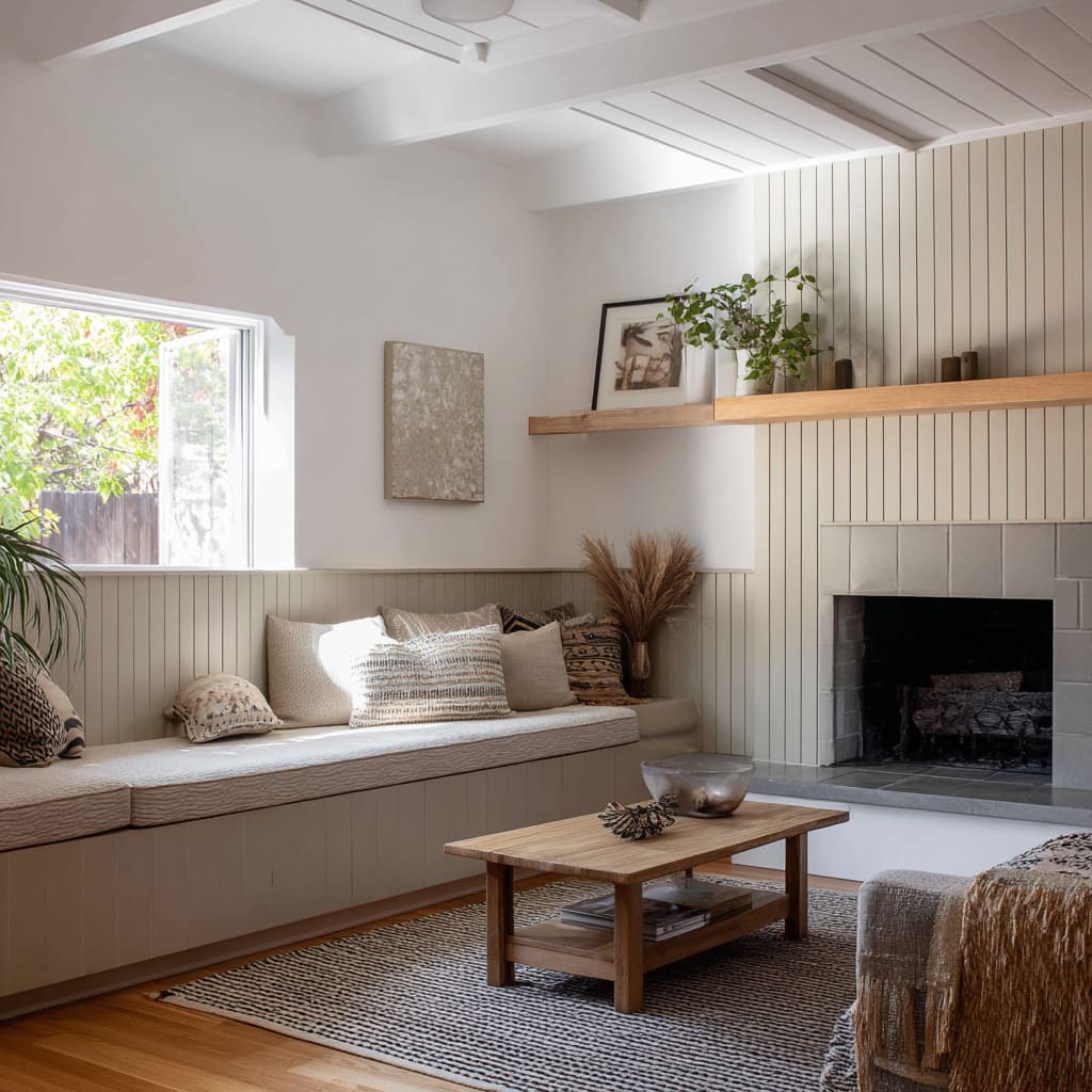Narrow mushroom-toned vertical boards wrap a corner bench and fireplace with light modern rhythm