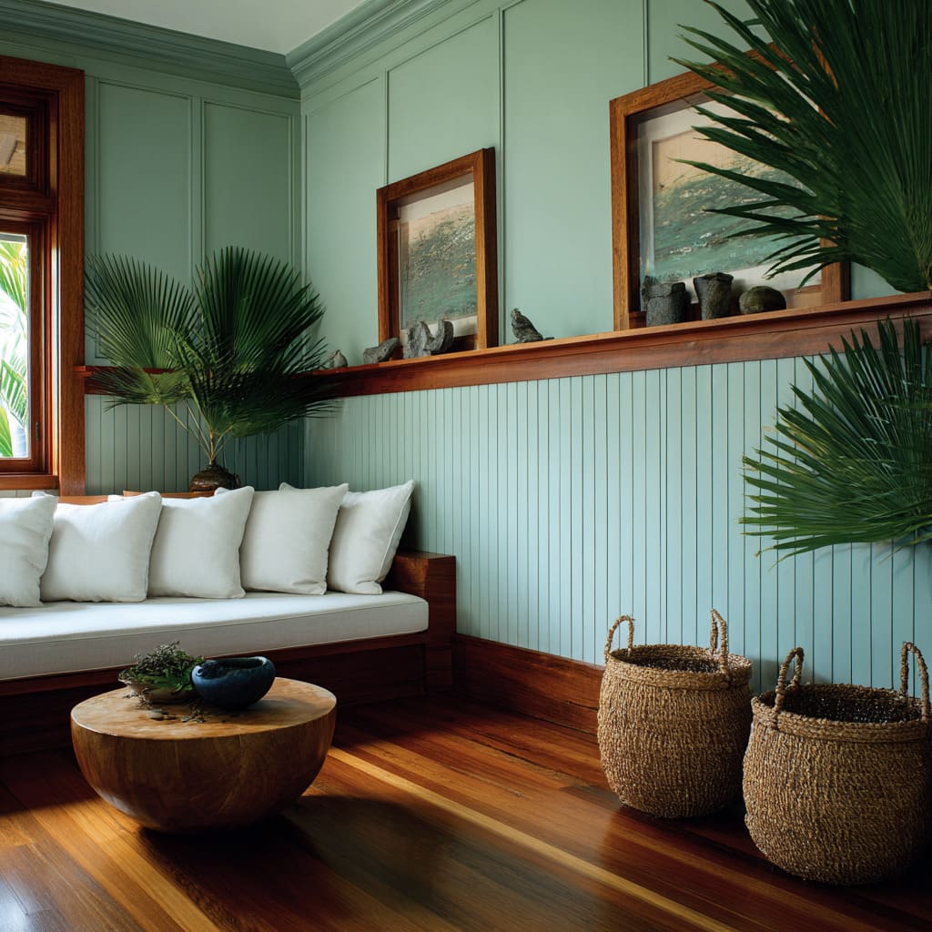 Sea-glass beadboard meets tall stiles above a mahogany display shelf