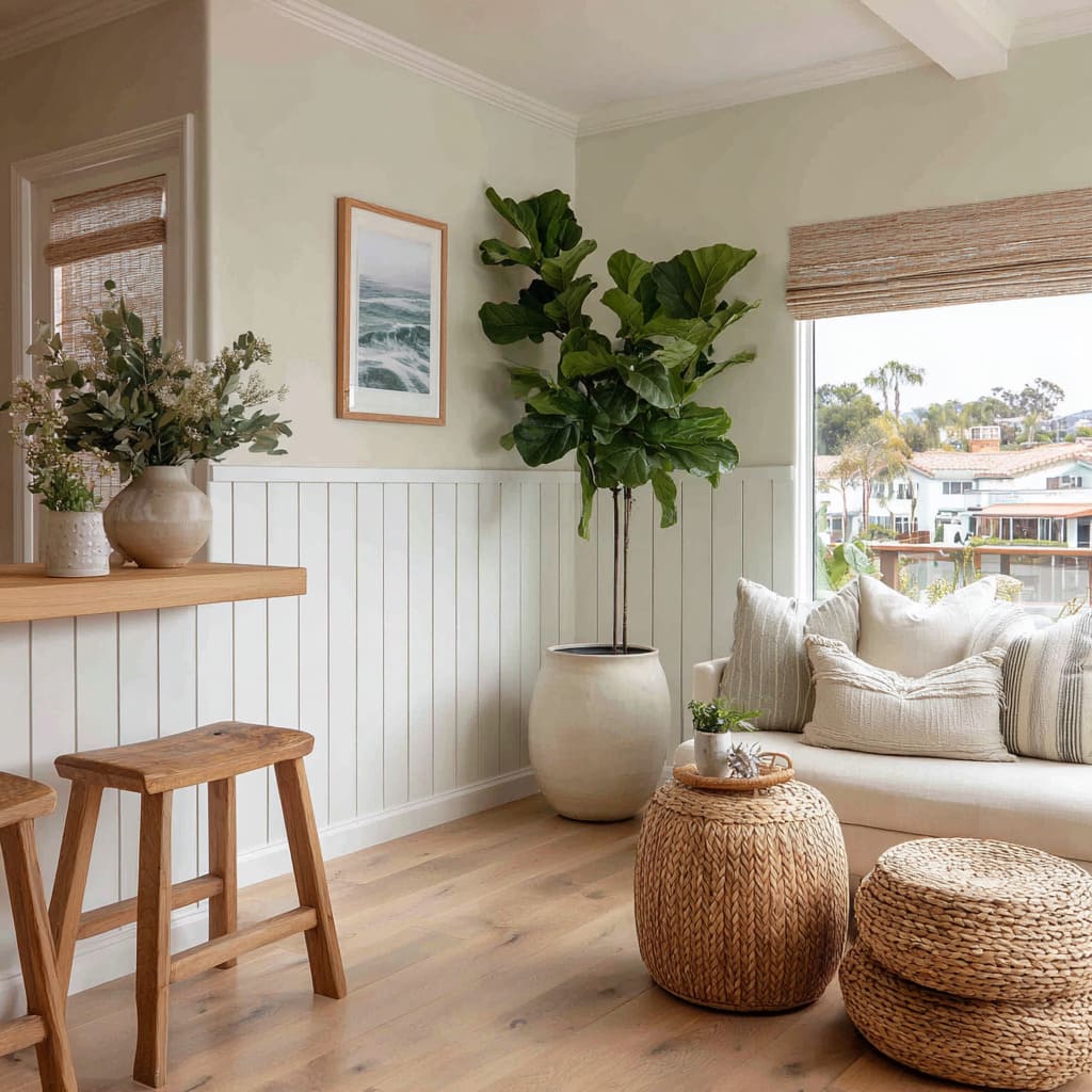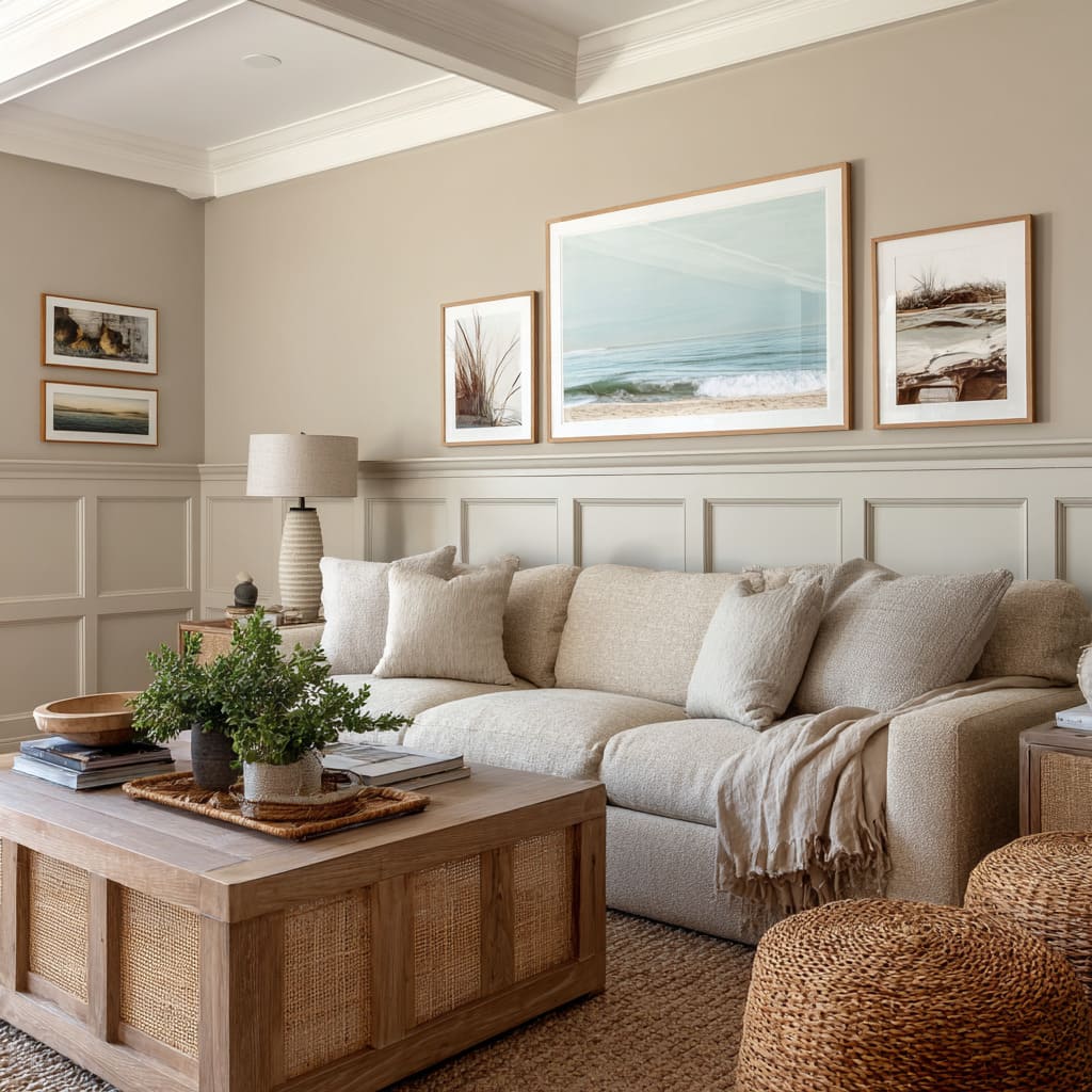 Slim box wainscoting in muted tones wraps the room with soft coastal textures