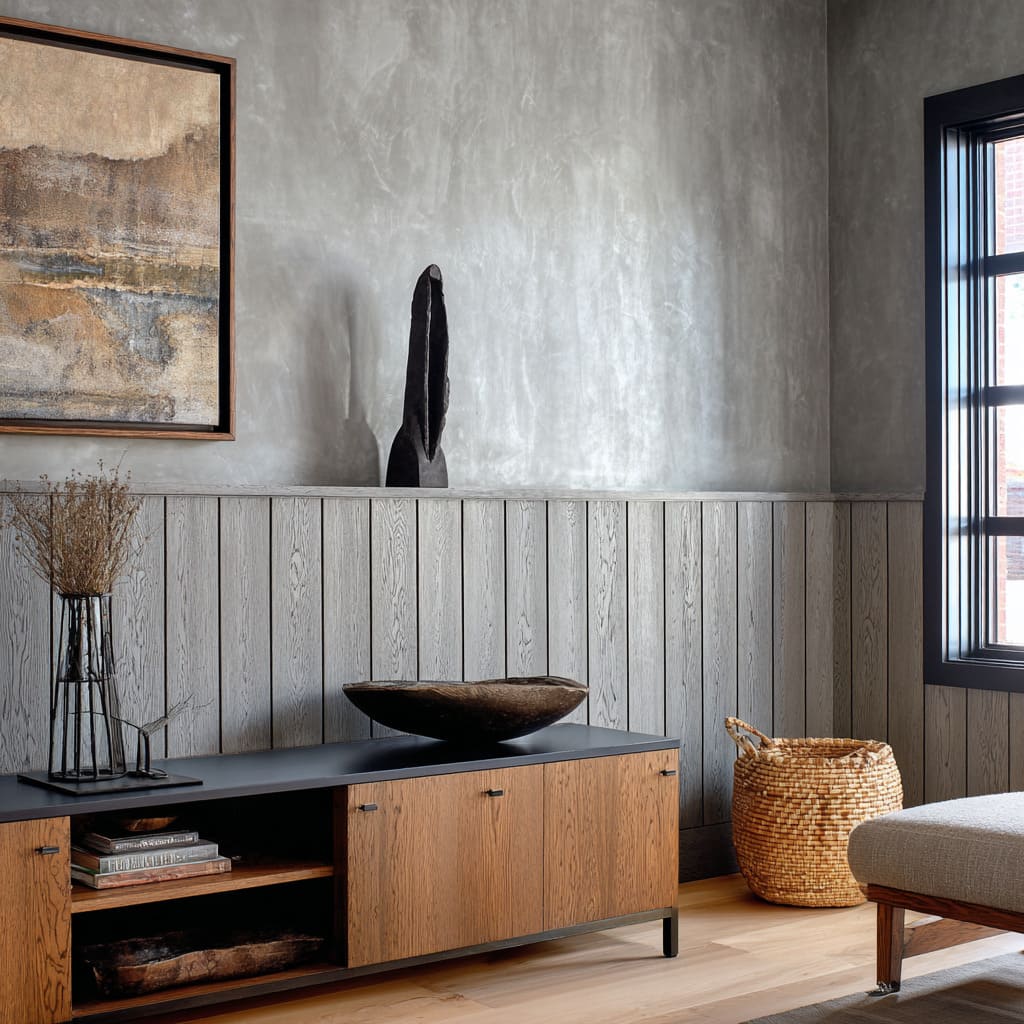 Smoked-oak planks pair with burnished gray plaster and sharp black frames