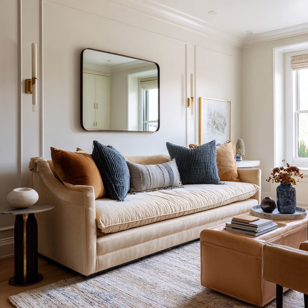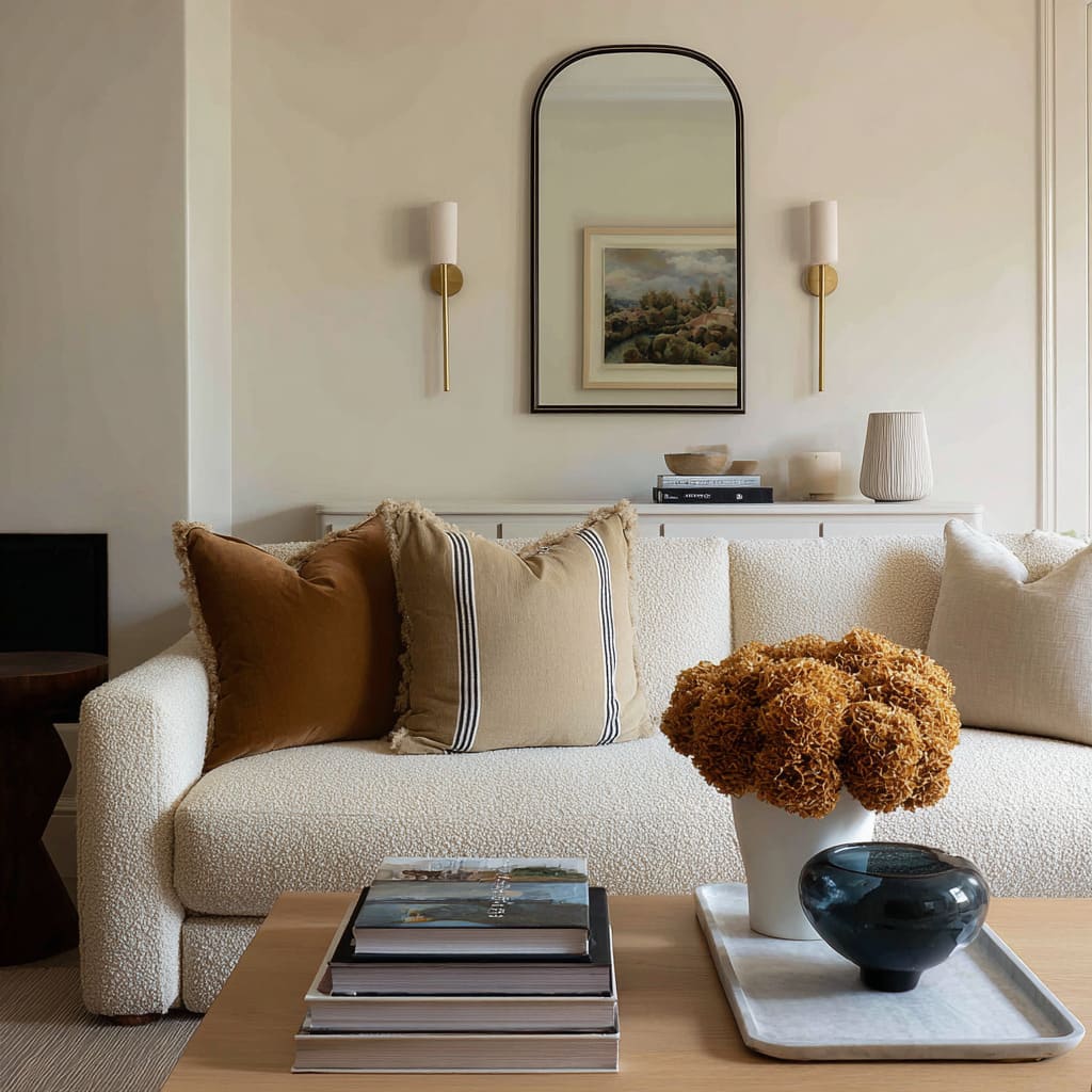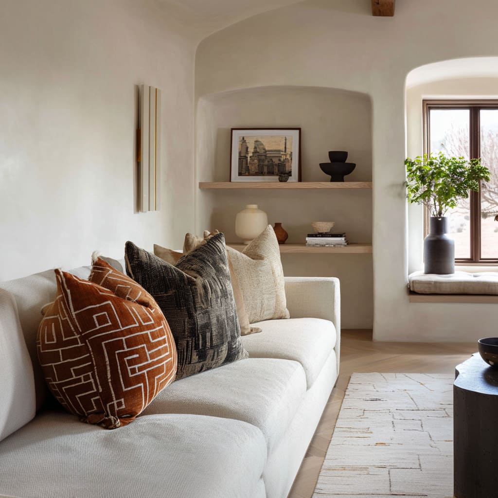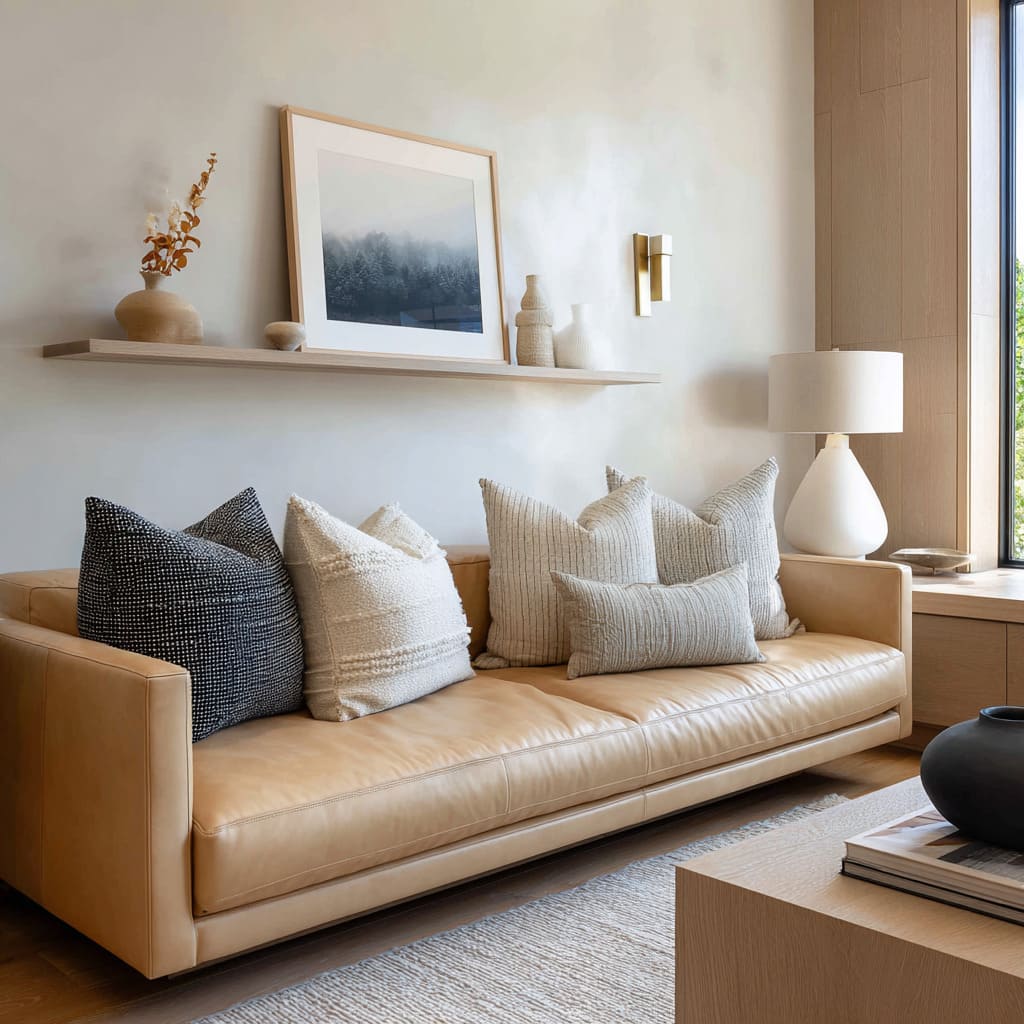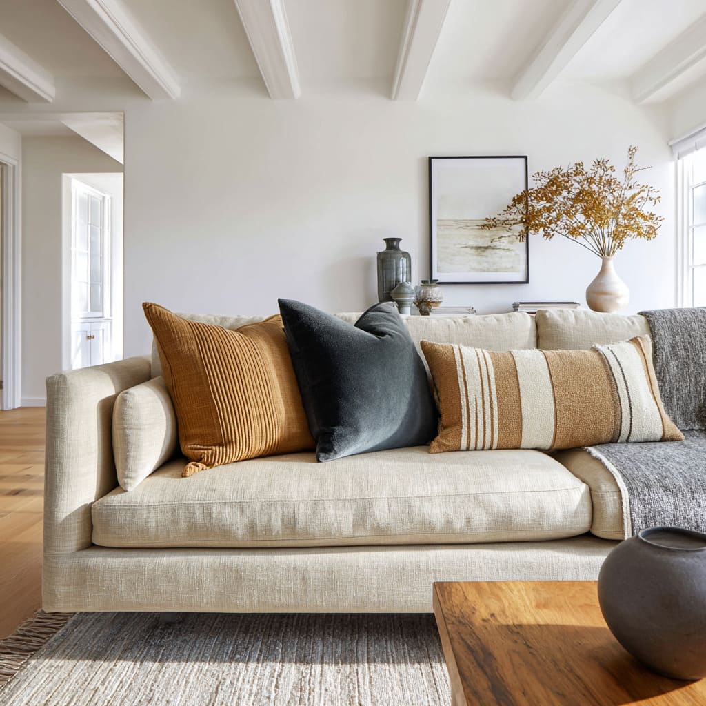 A warm camel or clay pillow placed where the body naturally sits sets the emotional tone, then smaller neutrals keep it from turning into an obvious color story. The effect is subtle: the room feels warmer without looking “more colorful.