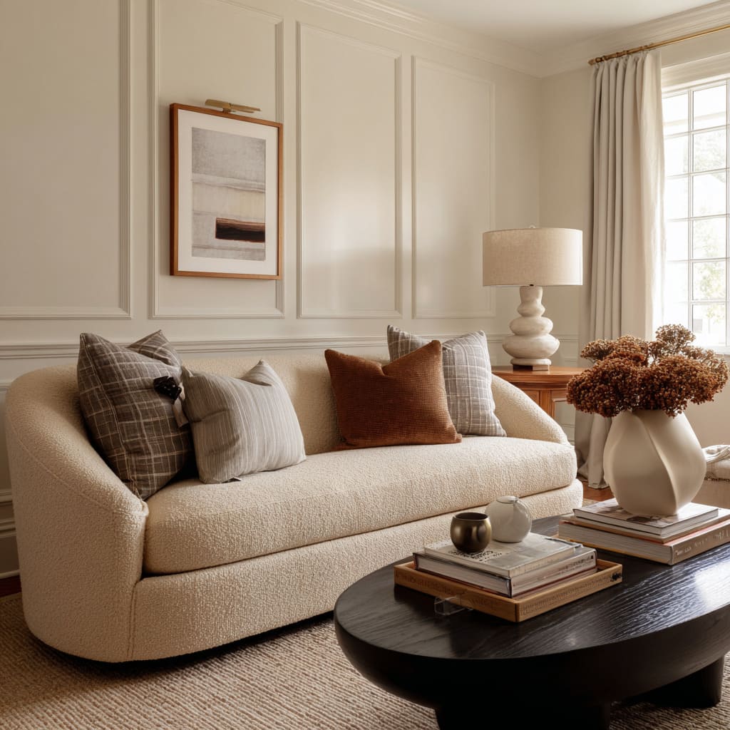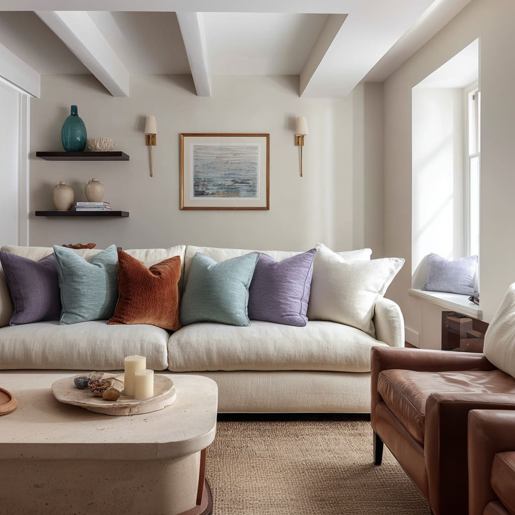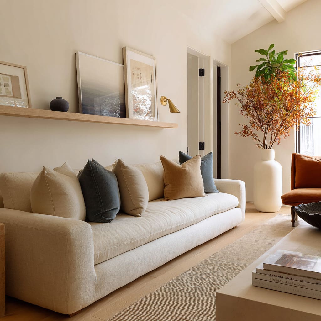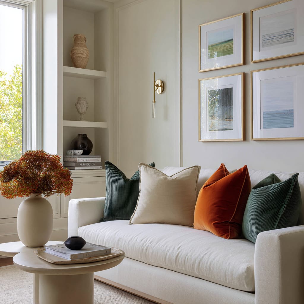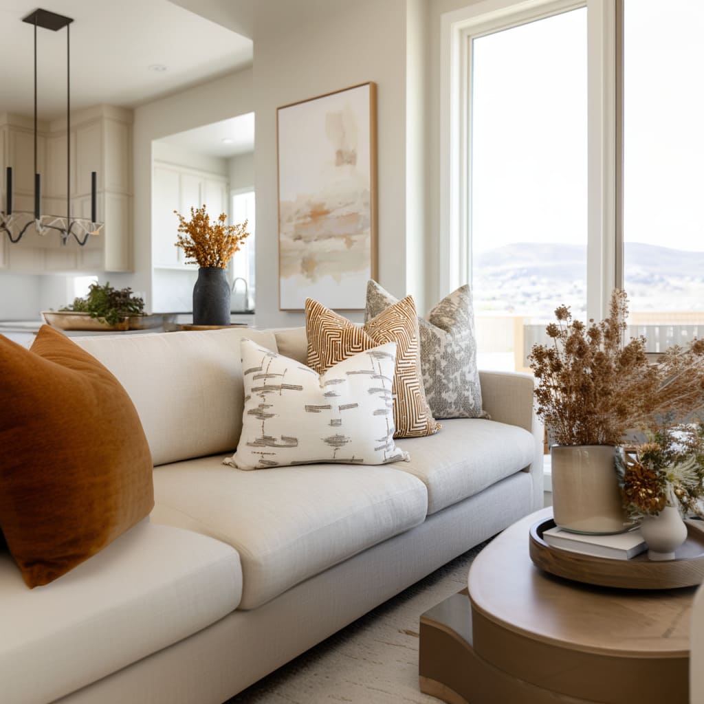 A warm camel or clay pillow placed where the body naturally sits sets the emotional tone, then smaller neutrals keep it from turning into an obvious color story. The effect is subtle: the room feels warmer without looking “more colorful.