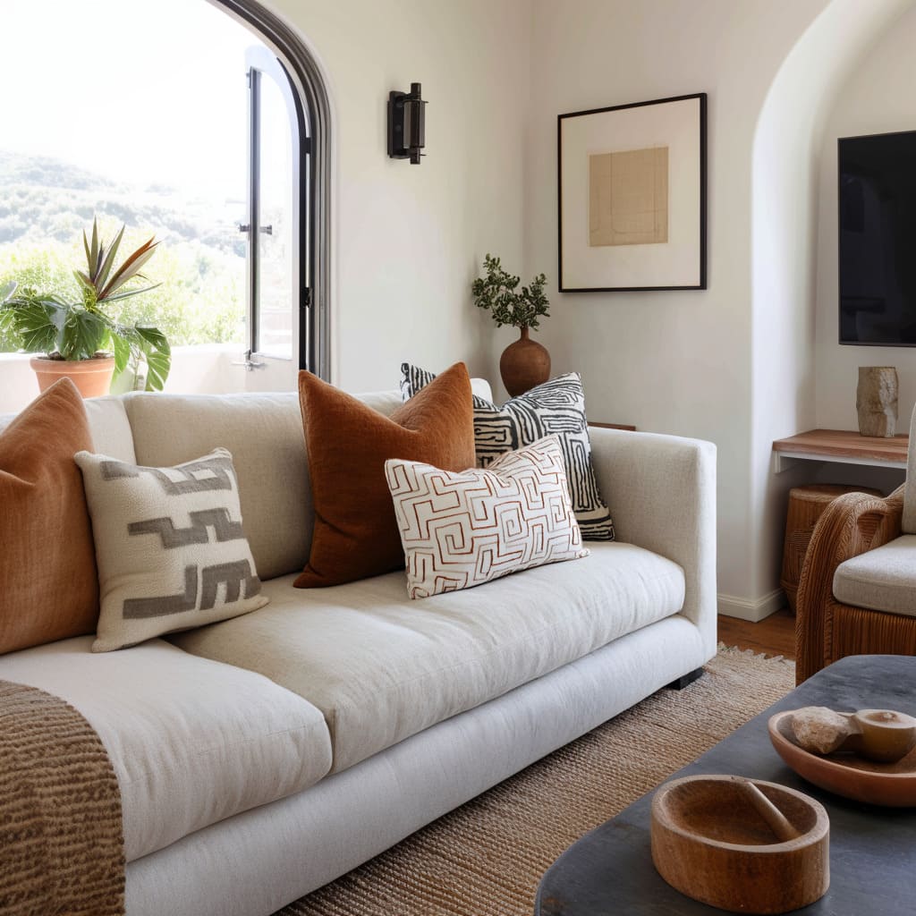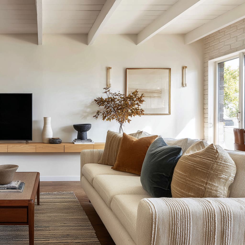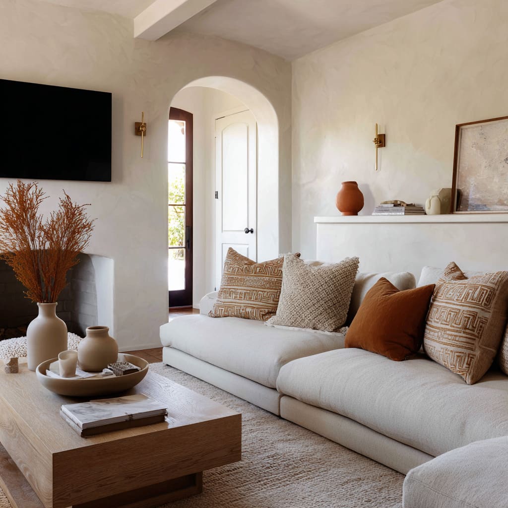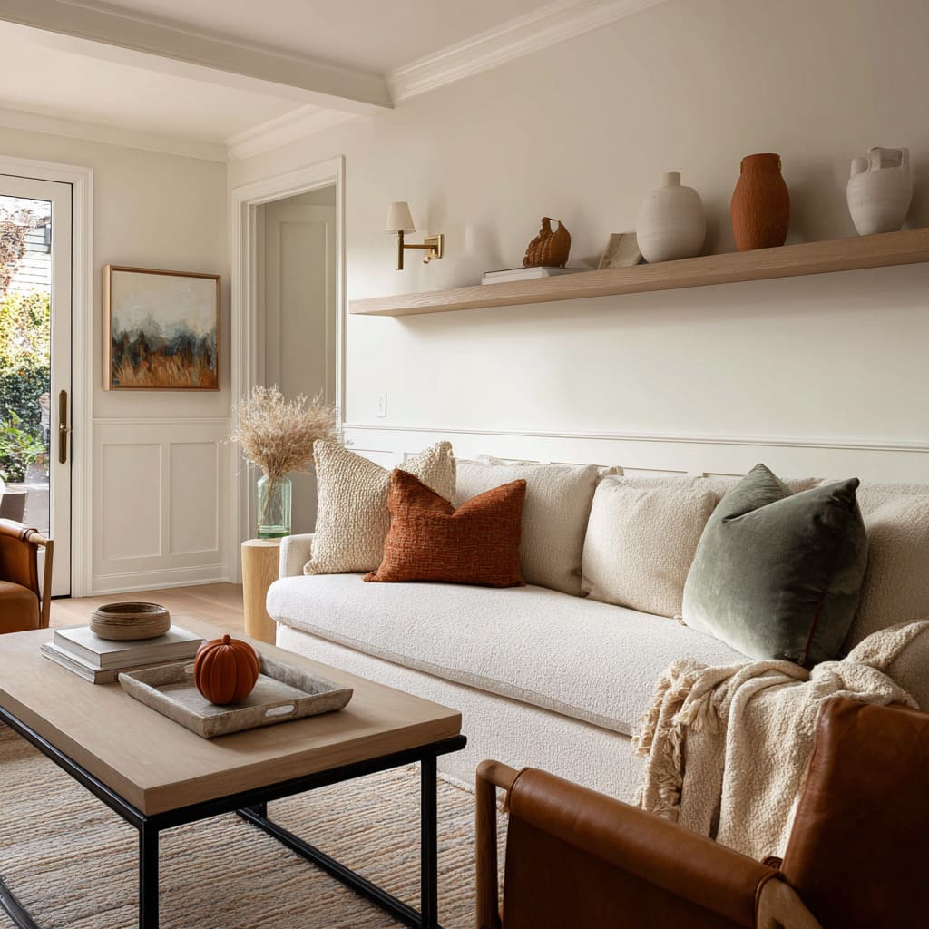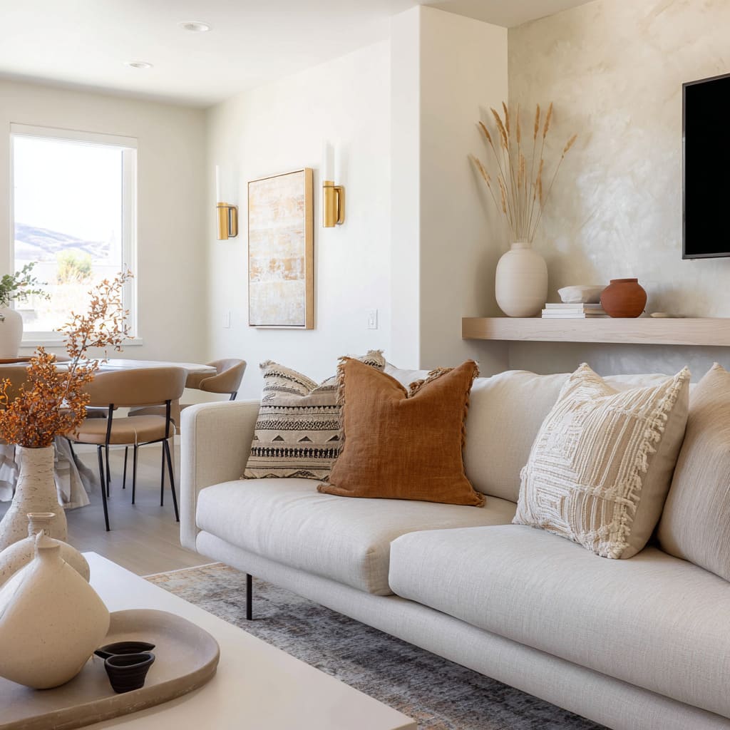 A warm camel or clay pillow placed where the body naturally sits sets the emotional tone, then smaller neutrals keep it from turning into an obvious color story. The effect is subtle: the room feels warmer without looking “more colorful.