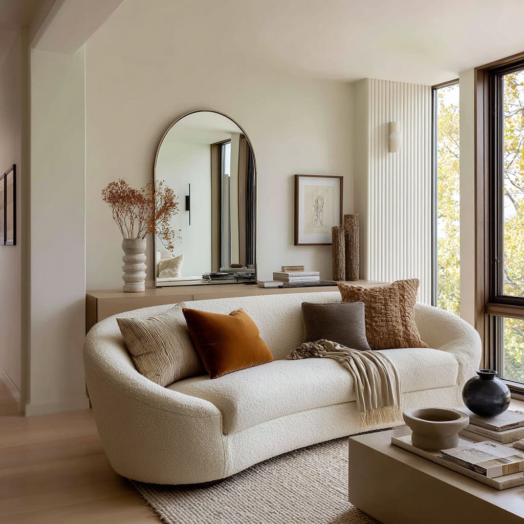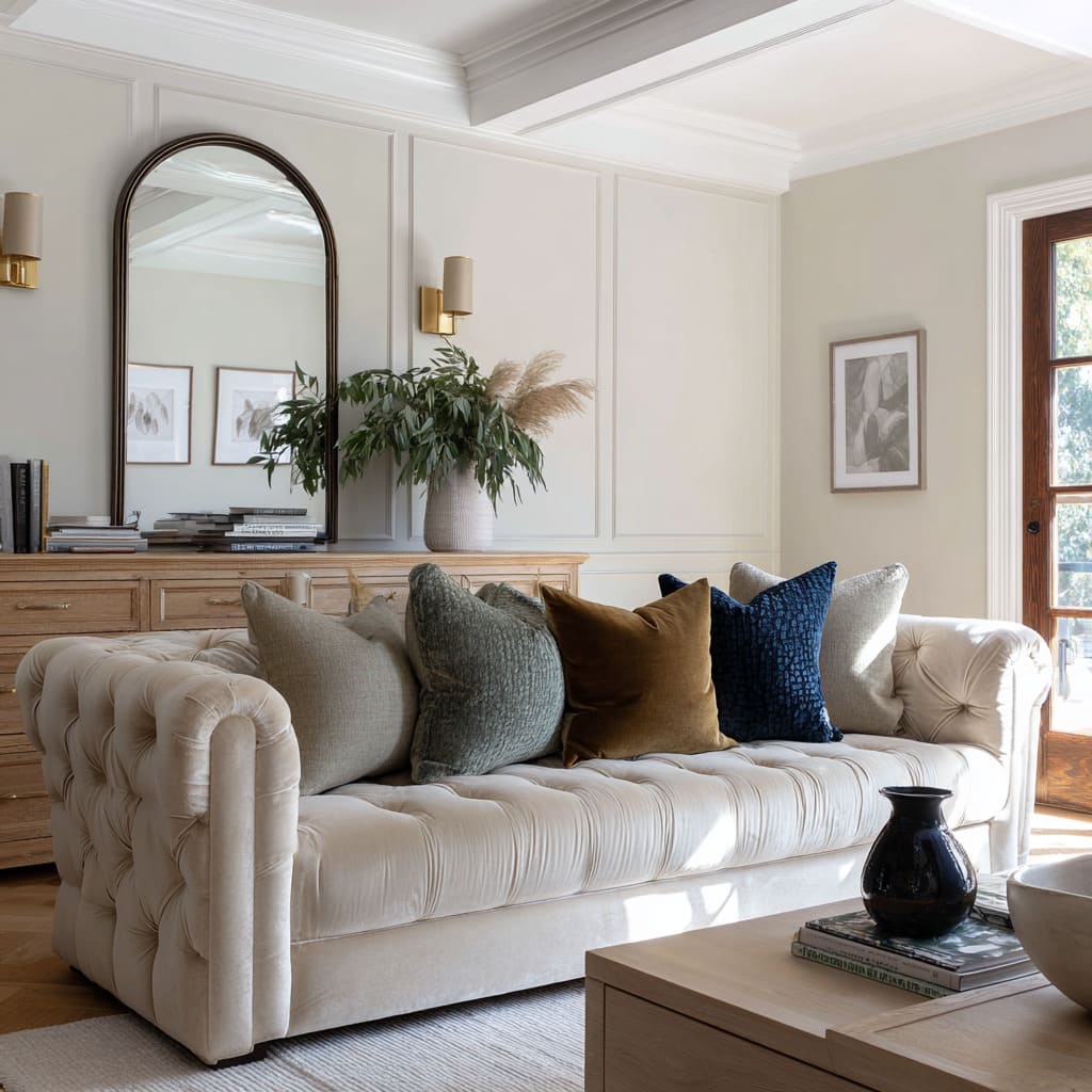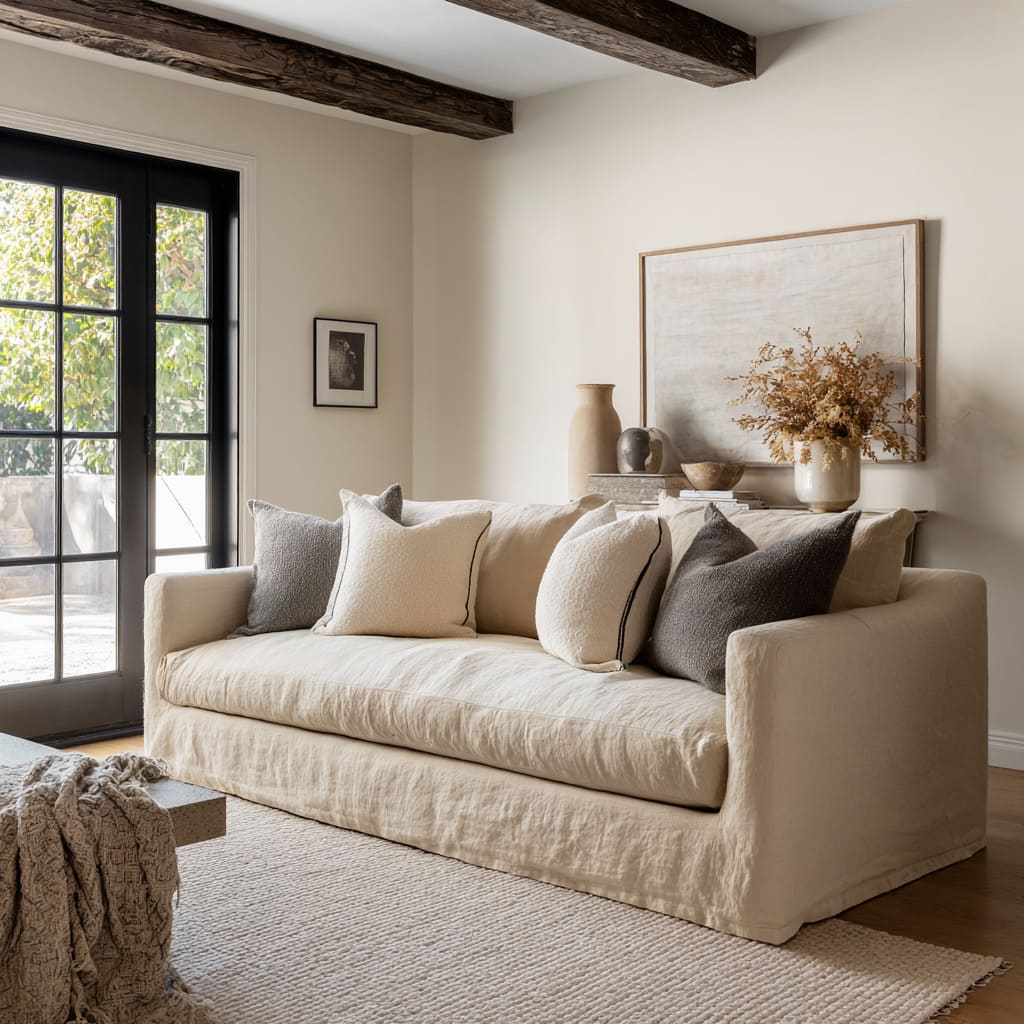 When both signals appear together, the sofa feels both styled and believable. This is one of the simplest reasons a neutral room can feel rich without feeling fussy.