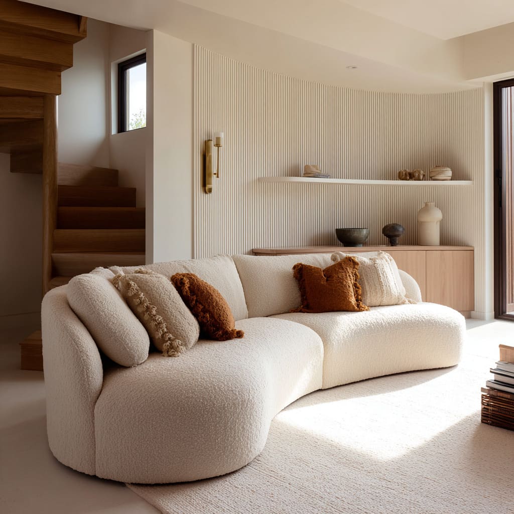 On beige seating, texture is doing far more than adding coziness. It creates micro-shadows that function like visual contouring on a face—subtle, but extremely effective.